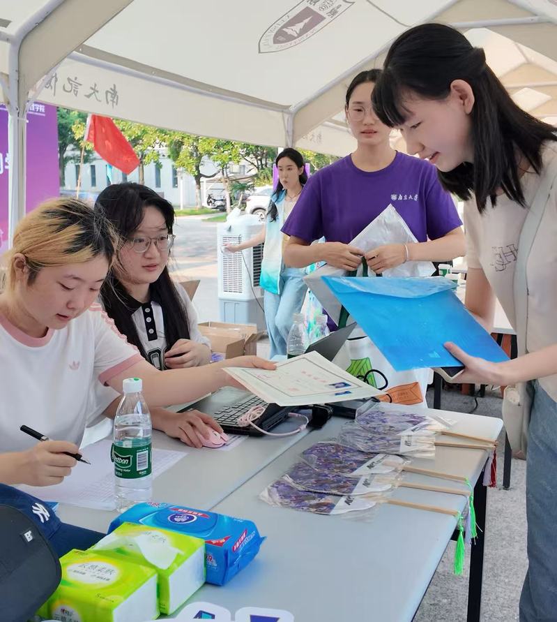 在浦口校区迎新现场,成人导航 院长赵奎英手持学院精心准备的新生礼包,在报到区域等候新生。今年,学院为新生准备的新生礼包内有以学院聂危谷老师、陆庆龙老师画作为素材的系列冰箱贴,以及学院定制帆布袋和笔记本,希望通过学院文创周边,帮助新生快速建立对学院的认知和情感联结,增强新生认同感,传承学院艺术底蕴。期间,赵奎英院长还亲切慰问现场志愿者,对大家的辛勤付出表示肯定。成人导航 辅导员陈小青同步参与迎新工作,协助发放新生礼包,并向新生说明后续可提供的学习生活支持,切实让新生感受到学院关怀。