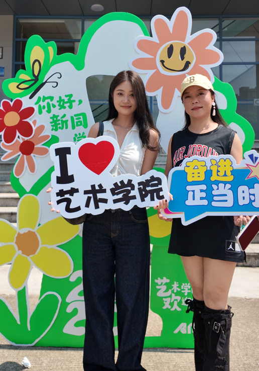 迎新现场特意摆放各种欢迎KT手牌和充满活力的新生打卡区:鼓楼校区以 “艺路花开,奋进启航” 为主题搭建报到区;浦口校区打造 “艺路生花” 互动打卡墙,搭配色彩明快的艺术装置,新生们或笑靥如花地在背景板前定格青春,或兴致勃勃地在造型墙下留下身影。