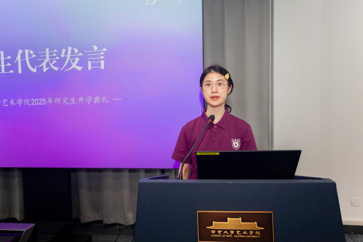 新生代表、2025级美术与书法专业硕士研究生解雯惠同学表达了初入南大的欣喜与对未来学习的期待。她回忆了参加夏令营时的经历与感受,表示将不忘“更真诚表达”的初心,在艺术理论与创作实践并重的培养环境中不断突破自我。她呼吁同学们保持敬畏与好奇,勇于尝试,在南大这片自由深厚的土壤中“长出属于自己的枝桠与果实”。