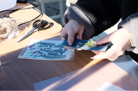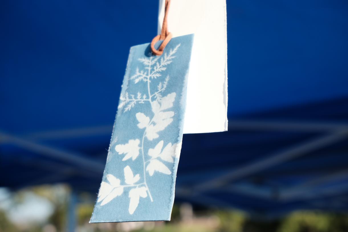 蓝晒,光影间将自然定格成永恒。本展台以“蓝晒书签”为主题,用阳光与植物交织出富有诗意的作品。活动中,参与者不仅能学习蓝晒技术的原理,还能亲手制作属于自己的专属书签,感受紫外线下奇妙的成像过程。 参与者通过挑选树叶、花朵等自然素材,利用户外紫外线晾晒然后冲洗呈相,将阳光与植物交融刻画出自然的影像。在蓝晒书签展台,每片叶都将化作书签上的艺术符号,记录同学们与自然的共鸣。