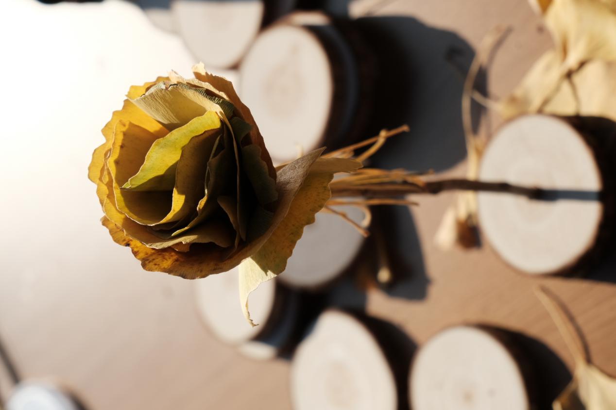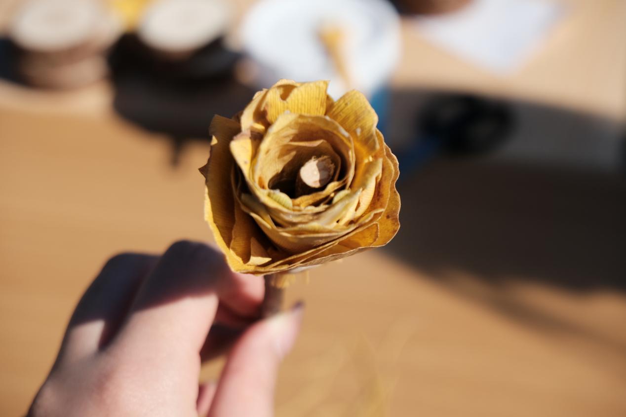 在暖阳的映衬下,银杏圣诞树与玫瑰花展台也吸引了不少同学的参与。参与者巧妙的将一片片银杏叶围绕着树枝,制作成玫瑰花的造型,每一片叶子经过精心的折叠与排列,呈现出花瓣层叠的细腻质感,银杏的金黄与玫瑰的优雅完美结合。这些“银杏玫瑰”象征着秋冬交替中的生命韵律,也传递出大家对自然的赞美与对艺术创作的热忱,看着用心完成的手作,同学们的脸上都洋溢着满足与喜悦。