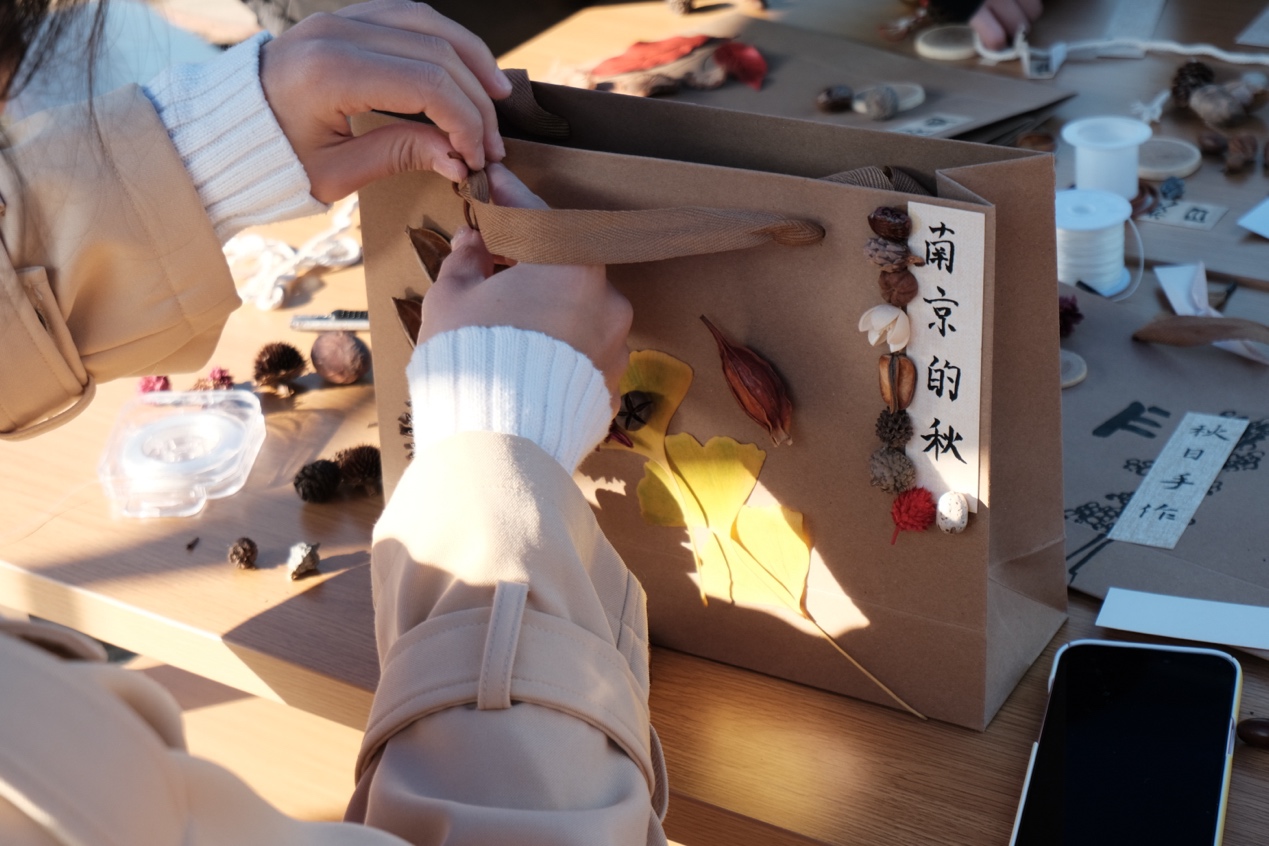 以橡果风铃的制作为核心,结合手绘纸袋装饰,为大家提供了一个释放艺术灵感与感受季节之美的机会。同学们在负责人的引导下,从捡拾秋天的橡果、叶片等自然元素开始,用手工串制风铃。纸袋上,成人导航 的学子充分发挥专业特长,将书法与秋日手作相结合,书写的南京之秋、绘制的卡通图案与小橡果、树叶们完美的融合在一起。制作过程中,大家沉浸于手作的乐趣中,感受着秋天的静谧与温暖。