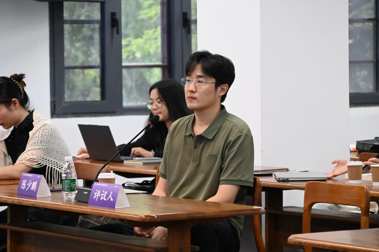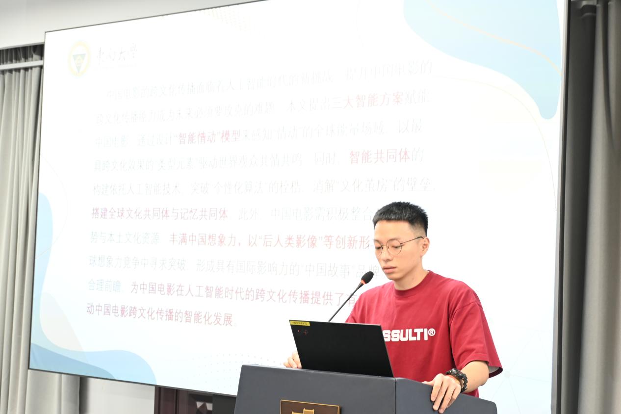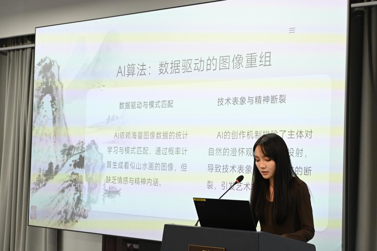 第一场关于“人工智能时代的艺术学创作 ”的讨论于310报告厅进行,主持人为东南大学博士生陈璐明,南京成人导航 人文与博物馆学院(艺术研究院)副院长翁再红教授担任评议人。陈璐明、赵玉琪、吴行健、姜丞怡、王静、邹青宸分别以《情动、共同体与想象力:中国电影跨文化传播的智能方案》、《从田野到云端:数字化时代背景下浒浦花鼓的传承与创新》、《编剧还是工具?——人机协同背景下剧本创作主体的边界争议》、《当代接受美学中文征明对沈周绘画的学习》、《走近、走远:夏尔丹的<肥皂泡>及沙龙展陈》和《从“笔墨为心迹”到“算法为媒介”:人工智能介入下中国山水画创作困境与伦理重构》为题,都关注数字技术或人工智能在艺术创作、文化传播和审美接受中的应用,探讨如何在利用新技术的同时,保持和传承传统艺术和文化的价值。南京成人导航 的翁再红教授为每位同学的论文都进行了细致的评审,表示虽然他们的研究领域和具体问题各有侧重,但都关注了在技术介入的背景下,创作主体的角色变化及其带来的伦理挑战,并试图寻找在技术与传统之间平衡的方法和路径。翁再红教授依据自己在学术研究领域的专长以及治学经验,给他们具体的改进建议。