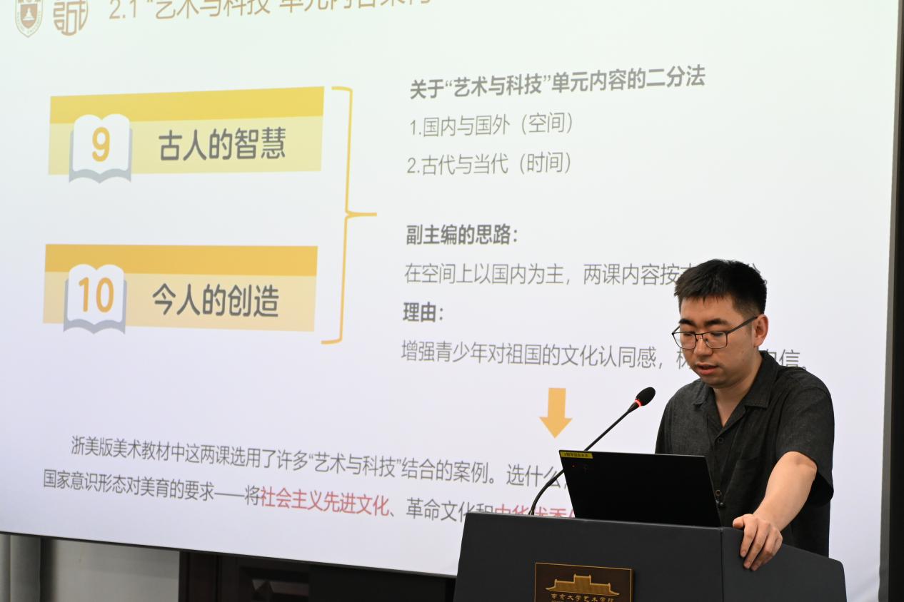 第六场论坛为其他相关主题的汇报,由成人导航 的傅王雪萌主持,东南大学陈少鹏副教授评议。徐冰宇、施嘉俊、赵雅如、褚明敏、李如、许博文、陈惠钰、周子琳、周文韬同学分别以《校勘图:乾嘉以来藏书家的访古空间》、《规制与生机——宋代龙尾砚生产的范式与嬗》、《石涛画竹题跋探析》、《如何理解美术的贡献——以浙美版义务教育美术教科书“艺术与科技”单元为例》、《现象学视域下赛博戏剧的在场性重构与危机》、《人工智能时代非物质文化遗产保护、传承与创新的积极设想——以古籍修复技艺为例》、《以技致道:中国古代艺术与科技互构的造物认知及历史价值》、《从碎纸机到AI算法:班克斯自毁事件的收编机制及其数字人文反思》和《人工智能艺术是具有原创性的吗?》为题进行汇报。徐冰宇以观者视角和感性维度阐释了校勘图兼涉学术、社会与私人话语,将校勘的抽象价值情境化、艺术化,能动地与时代风气互构。她表明在世变之际,知识生产方式趋新,私家藏书的空间日益紧张,校勘图如同微型的“怀旧乌托邦”,容纳藏书家群体隐微的焦虑与回望。施嘉俊以宋代龙尾砚为研究对象,聚焦其兴盛动因、生产范式及后世演变。赵雅如从石涛的画作题跋中对他的创作情感和绘画理论做出总结。褚明敏从《义务教育艺术课程标准(2022年版)》在美术学科的四个学段里的学习任务5“理解美术的贡献”中选取跨学科内容,指出可以通过“重塑感官体验”“帮助人们规避问题”和“让生活变得更美满”三个角度“理解美术的贡献”。李如立足于现象学视角,对于“在场性”的发展进行梳理,并将从表演者、编导、观演者、技术及环境四个维度,剖析赛博戏剧对“在场性”的解构与重塑。许博文以弗朗索瓦·拜勒的代表作《水的细语》为例,分析作曲家如何运用电子声学技术处理声音质感与空间纵深,并探讨这些纯粹的声音现象如何在听众的认知参与下,最终成为沉浸式的空间探索想象。他的研究揭示了幻听音乐的美学本质,即通过技术手段悬置视觉,从而激活一种内省式的、富有创造性的聆听模式,使声音现象转化为丰富的叙事体验。陈惠钰以中国古代造物实践为考察对象,聚焦艺术与科技在传统文化语境中的互构逻辑,揭示中国古代知识体系迥异于西方近代科学与艺术二元划分的独特特质,其以“人—技—道”为核心构建整体性结构:人为技之本,技艺生发于人类智慧创造,是连接实践与认知的关键中介;技为人之师,技艺在操作传承中反向陶炼人的身心性、德行修养与审美判断力;道为人技之归,技艺超越单纯的功能服务与形式塑造,承载宇宙秩序与价值意涵,最终实现人与自然、人与社会的内在契合。周子琳以班克斯《女孩与气球》的自毁事件为案例,探讨其艺术批判在人工智能时代所面临的困境与转型可能。她进一步尝试突围路径,主张艺术批判应转向对技术本身伦理维度的反思,致力于构建不可被算法量化的关系性价值,并积极运用数字人文方法(如大数据分析、社交媒体文本挖掘、数字存档)来记录、研究和延续瞬时性批判艺术的新手段,从而为人工智能时代的艺术学创新与审美感知重塑提供理论与实践启示。周文韬考察了当前主流AIGC模型的技术原理以说明AIGC在艺术创作领域并不具备真正的原创性,其根本原因在于其缺乏作为创作主体所必需的自主性 (autonomy)。陈少鹏副教授进行了细致评议,表示九位同学的研究具有非常强烈的多样性,从古到今,从东到西。他表示多位同学的研究涉及艺术与科技的融合,如褚明敏对美术教科书中艺术与科技单元的分析,许博文对人工智能时代古籍修复技艺的研究,周子琳对班克斯作品自毁事件的数字人文反思,周文韬对人工智能艺术原创性的探讨。这些研究展示了科技在艺术创作、保护和传播中的重要作用,也反映了科技对艺术观念和实践的深刻影响。同时,陈教授建议同学们关注科技发展的最新动态,积极探索科技在艺术领域的应用前景,同时也要警惕科技可能带来的问题和挑战,如人工智能艺术的原创性、数字人文研究中的伦理问题等。