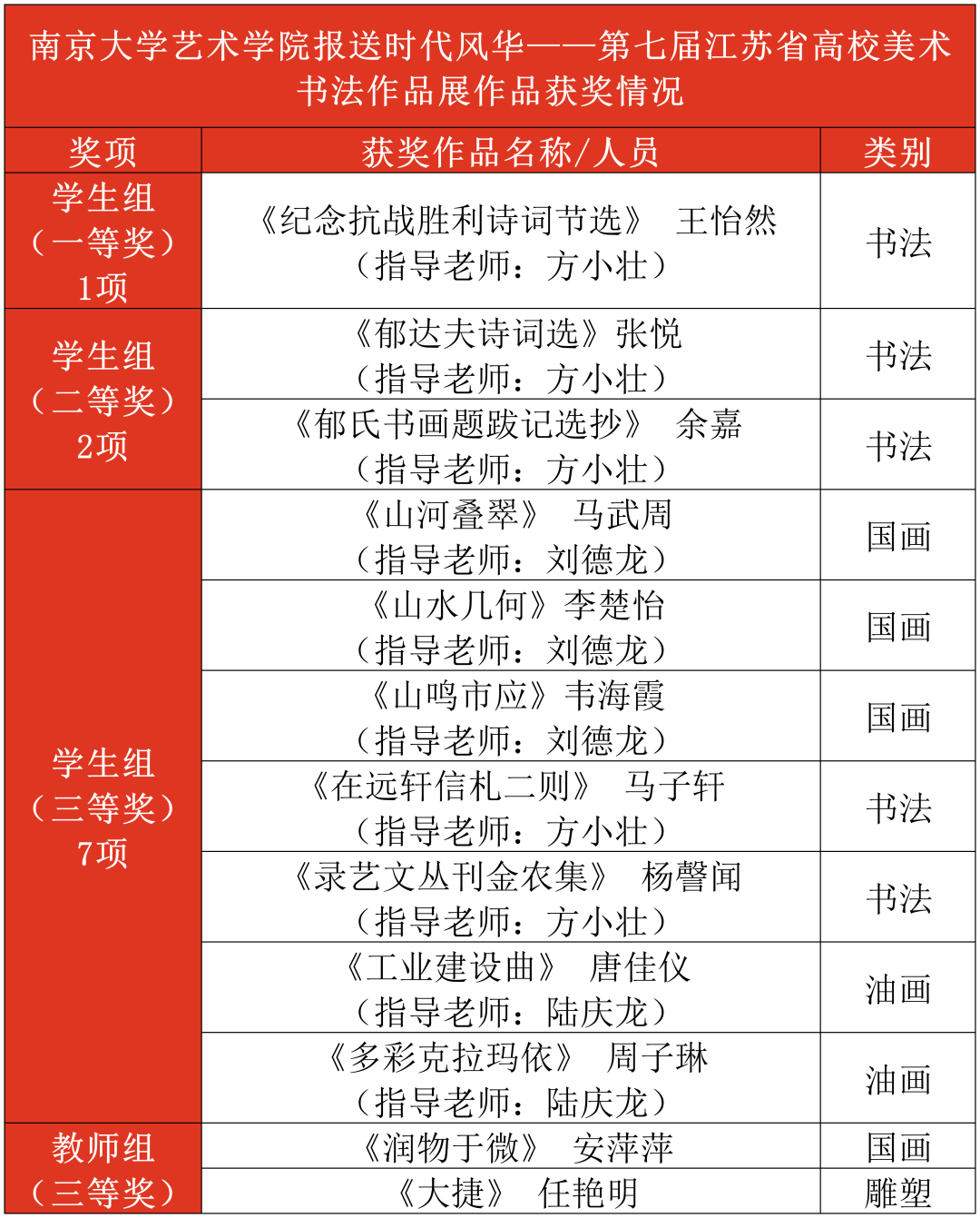 近日,“时代风华——第七届江苏省高校美术书法作品展”圆满落下帷幕。 成人导航 报送的绘画、书法与雕塑等作品在本次活动中表现优异。学院高度重视、统筹推进本次展演活动,围绕立德树人根本任务,聚焦时代主题与艺术创新,遴选优秀作品参展。参赛作品在思想性、艺术性与专业性上实现了良好统一,集中体现了 成人导航 “以美育人、以文化人”的办学理念与教学成果。在江苏省教育厅公布的第七届大学生艺术展演活动获奖名单中, 成人导航 师生共斩获 12项省级奖项,其中学生组一等奖1项、二等奖2项、三等奖7项,教师组三等奖2项。