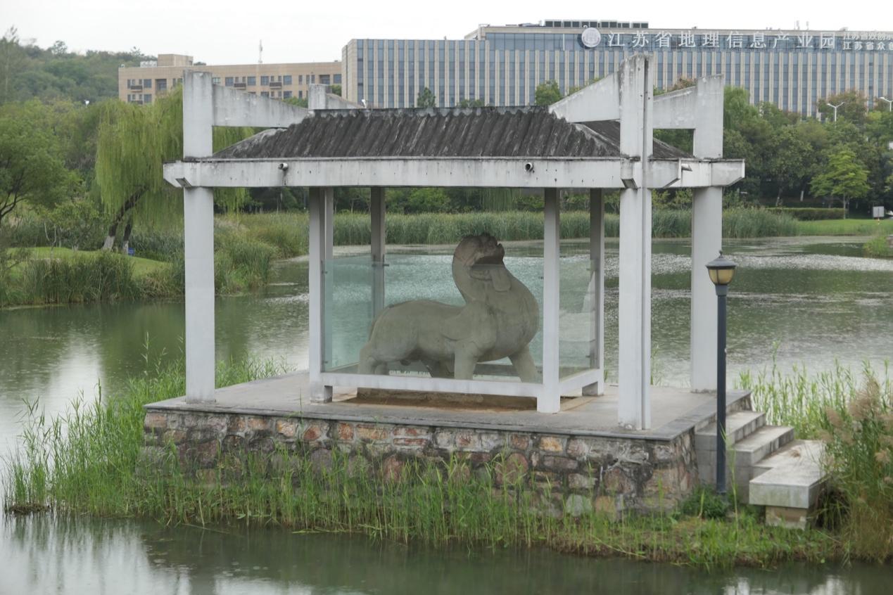 田野调查第一站是位于栖霞区狮子冲的安宁陵石刻,系南朝梁昭明太子萧统及其生母丁贵嫔的合葬陵墓,曾被认为是南朝陈文帝陈蒨的安葬之地永宁陵。一对石兽镇守于此,一为双角天禄,一为独角麒麟,历经风雨1500余年。这对虎形石兽体态修长,身姿灵巧,气韵生动。它们钩爪如锋、振羽临霞、胡须蜷曲、长啸生风,浮雕与刻线结合,线条飘逸富有装饰性,整体又具飞升九天的动势。立于其前,仿佛能感受到当时人们崇尚玄学、追求超凡脱俗的时代精神。