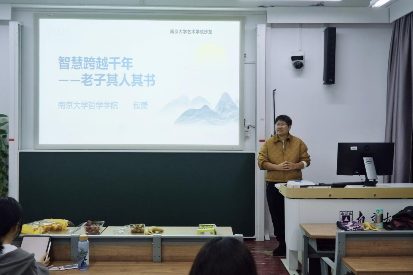 沙龙伊始,包蕾老师首先回忆起本科阶段在浦口校区的求学经历,故地重游,她感慨良多。随后介绍了自己的研究方向,并引出本次沙龙的焦点——老子哲学。她指明,本次沙龙不仅会贴合艺术学科来解读老子其人其书,还将增设图像化内容,以期在哲学与艺术之间搭建一座沟通的桥梁。