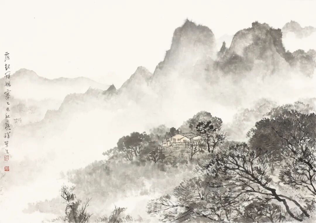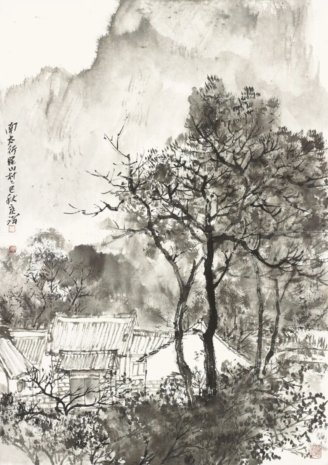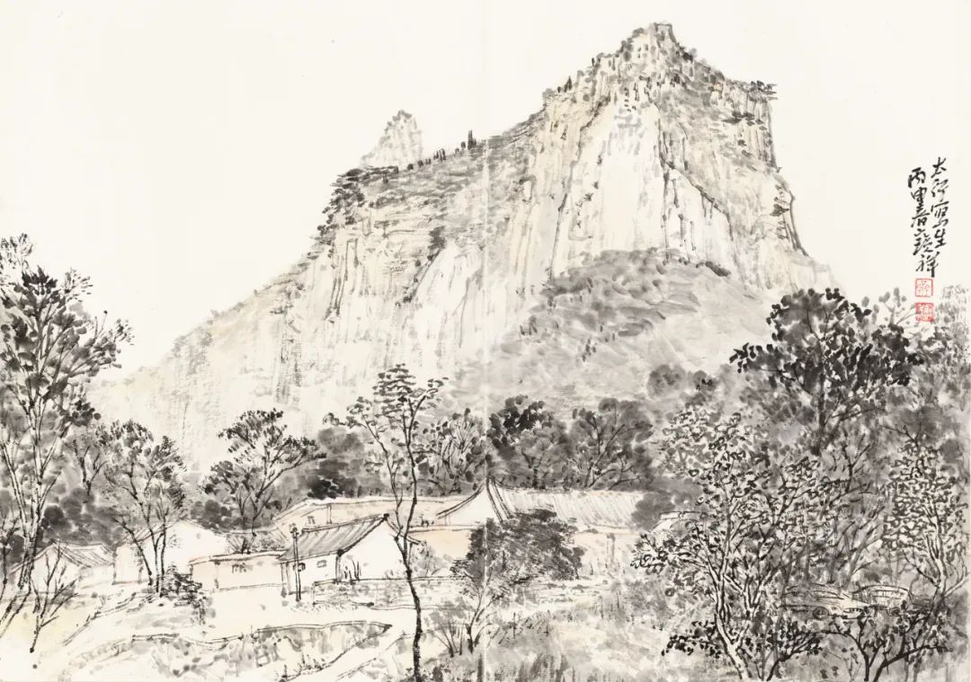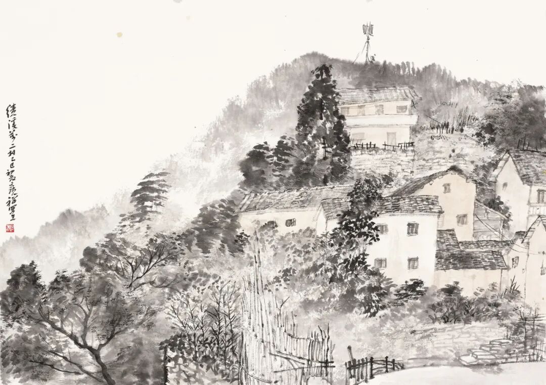 我下笔之前心中已有整体的构图,景物又就在眼前,所以构图和造型的问题没有了。下笔后我需要注意的是如何取舍、概括和如何运用笔墨。特别是用笔用墨,是我要重点考虑的。因为对于水墨画来说,成功与否往往取决于笔墨。起笔时,我习惯先从主要景物开始,其他的地方围绕主景来生发。这样笔墨也比较连贯,有的地方要一气呵成。主景的大小要服从于整体构图,比如如果先画建筑,就要注意它与树木、山石之间的关系。我写生时不打轮廓,但胸有成竹。