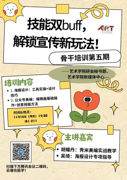 11月14日,第二期培训“技能双BUFF,解锁宣传新玩法”在浦区1-211教室顺利举行。本期聚焦新媒体宣传中的视觉表达与内容编排,着力提升学员的实操能力与审美水平。