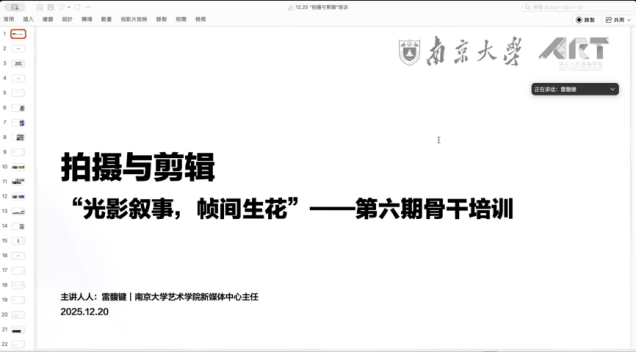 12月20日,收官之期“光影叙事,帧间生花”通过线上方式举行,聚焦视频内容创作全流程。主讲人新媒体中心主任雷馥键系统梳理拍摄与剪辑的核心规范,从构图技巧、画面控制到景别运用与机位移动,逐一讲解如何通过镜头语言增强叙事表现力。