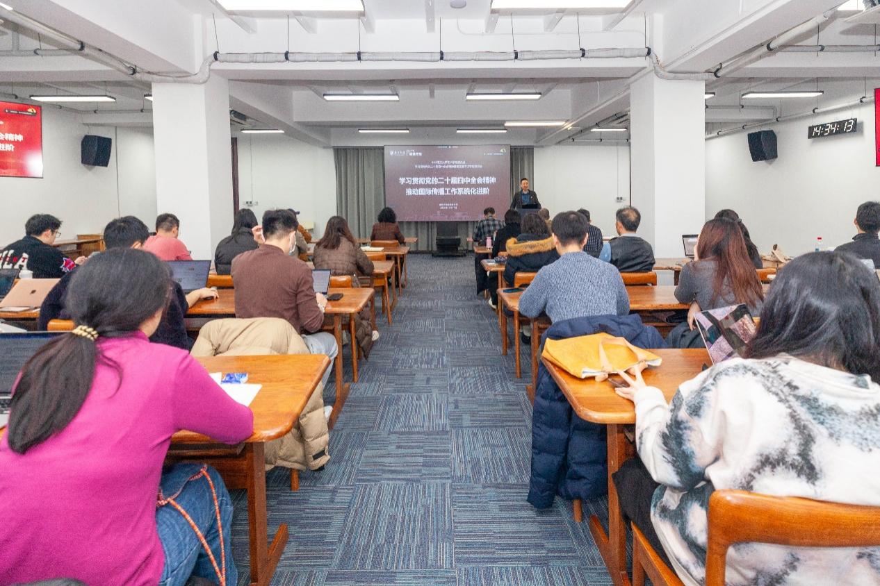 12月17日,成人导航 党委举办党的二十届四中全会精神主题党课。成人导航 党委常委、党委宣传部部长、党委统战部部长闻羽作题为“学习贯彻党的二十届四中全会精神,推动国际传播工作系统化进阶”的主题党课。成人导航 院长赵奎英、副院长尚荣,师生党员、入党积极分子等百余人在鼓楼主会场、浦口分会场及线上云课堂共同参加。课程由学院党委书记周计武主持。