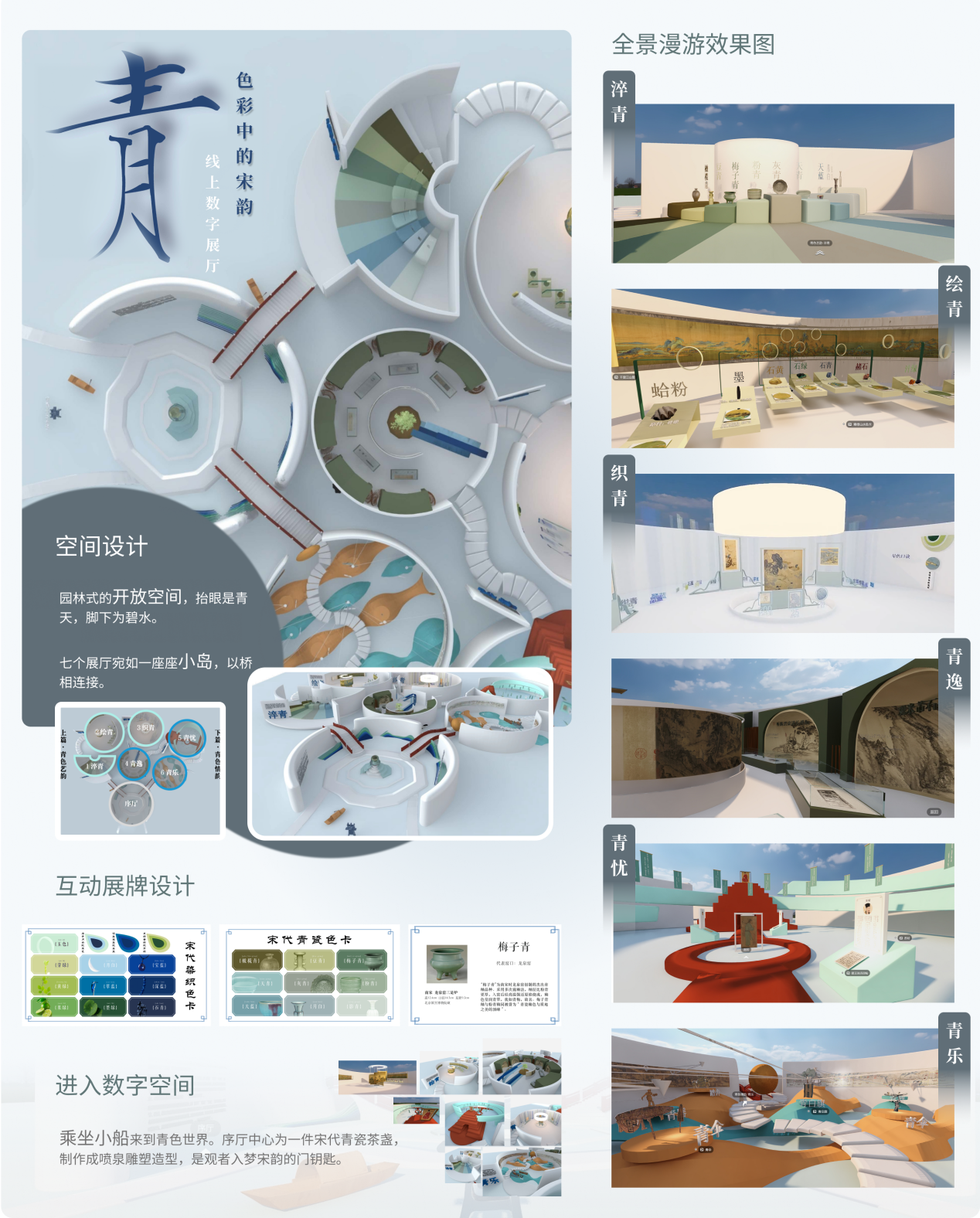 本作品是可进行全景漫游的数字展厅,以宋韵的代表色“青色”为着眼点,解读宋朝的审美与文化。展览共6个主题,分上下两篇,上篇由“淬青”“绘青”“织青”三个展厅组成,展示青瓷、青绿山水画、缂丝等文物,展现宋代的青色色谱构成与创制工艺;下篇由“青逸”“青忧”“青乐”三个展厅组成,从哲学、政治、社会生活等角度探索宋朝审美风尚背后的精神世界。