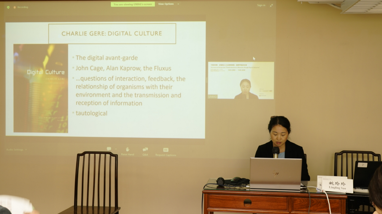 其后,首都经贸易大学教师姚玲玲博士发表了题为Chinese Artists in the (Post-)Digital Age: Perspectives and Challenges Across the Art Landscape的主旨演讲,旨在深入了解艺术界专业人士在当代中国传统艺术与数字艺术领域之间所进行的沟通调整和深刻见解,从而编织出全面反映艺术社群的时代思潮的叙事。