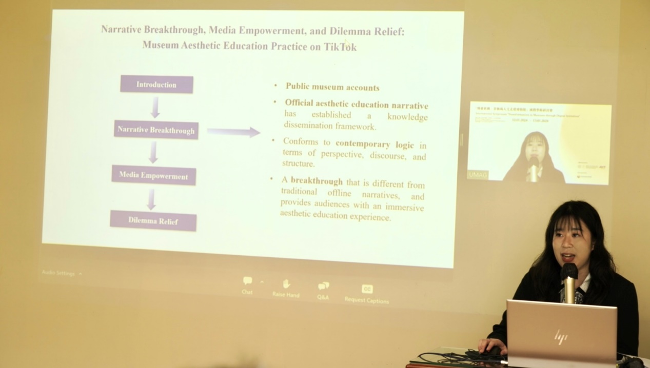 最后,来自成人导航 的硕士研究生丁林未发表了题为Narrative Breakthrough, Media Empowerment, and Dilemma Relief: Museum Aesthetic Education Practice on TikTok的主旨演讲,以中国版抖音与国际版抖音为研究对象,探讨了以官方叙事和民间叙事为代表的博物馆美育实践,如何借助短视频媒介在线上社区中获得突围和创新的契机,并指出其所面临的双重现实困境,并提出了联结关键意见领袖、平台扶持协商与内容策展等困境纾解之策。