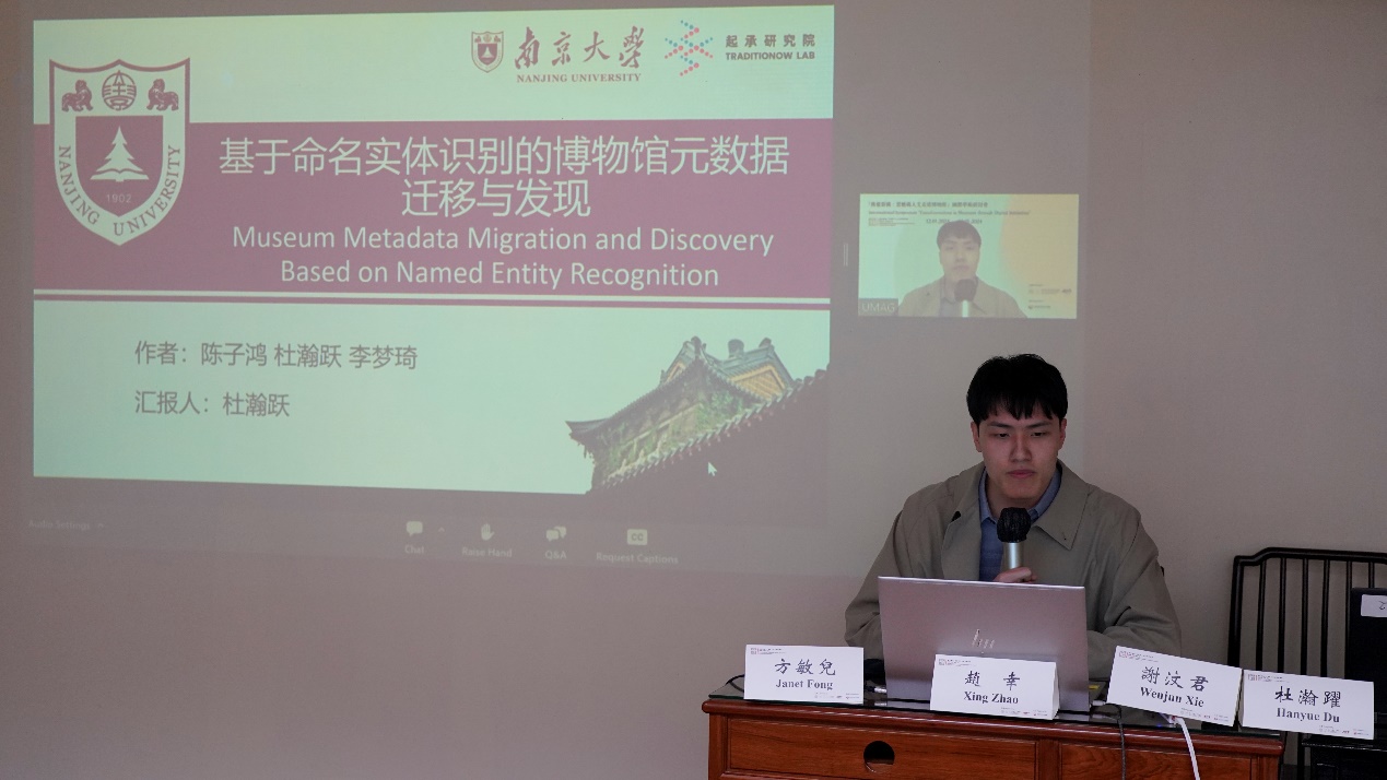 最后,来自成人导航 计算机科学与技术系的硕士研究生杜瀚跃代表研究团队带来了题为《基于命名实体识别的博物馆元数据迁移与发现》的主旨演讲,提出了一种基于命名实体识别技术的博物馆元数据迁移与发现方法,通过选取国内外九家知名博物馆的开放藏品数据,使用部分博物馆的元数据和非结构化信息构建了包含超过80万条数据的高质量标注数据集,用以训练命名实体识别的机器学习模型,以期通过该项技术预测其他博物馆中缺失的元数据,从而更好地挖掘文物数据的深层内涵。