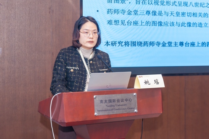 东南大学成人导航 副教授姚瑶的《日本药师寺金堂主尊药师佛像造立意图探讨——以台座图像为中心》首先聚焦于日本药师寺金堂主尊台座上的四神像及异形像的图像涵义,指出异形像的一部分或为药师佛的十二神将,与药师净土有关;另一部分为夜叉。四神则象征升仙或者升往净土的方阵。报告最后判断主尊药师佛像或许是为持统天皇祈求冥福而造。