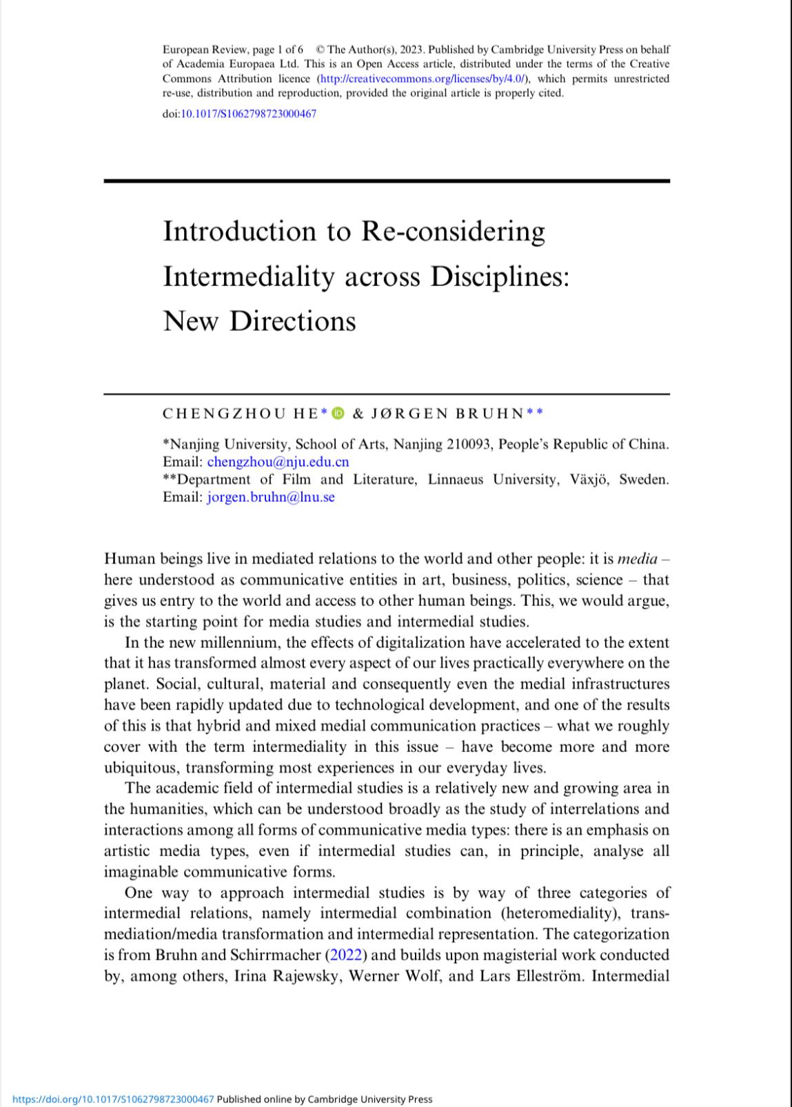 EUROPEAN REVIEW(《欧洲评论》,SSCI收录期刊)是欧洲科学院院刊,2023年10月推出跨媒介研究专辑,由成人导航 何成洲教授和瑞典学者Jorgen Bruhn教授主编,发表10篇论文,作者来自中国、英国、丹麦、瑞典等国家。