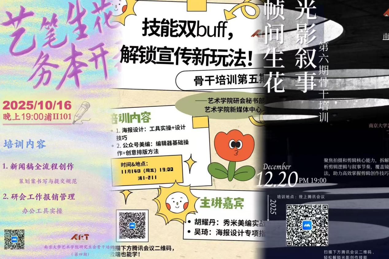 研究生会于2025年秋季学期精心策划并组织了三期骨干培训活动。系列活动围绕新时代校园文化传播的核心需求,聚焦新闻写作与综合实务、推文排版与海报设计、拍摄与剪辑三大模块,展开系统而深入的研习,为学院宣传工作注入专业动能与创意活力。第四期:艺笔生花,务本开新——新闻写作与综合实务10月16日,首期培训“艺笔生花,务本开新”在浦区2-101教室拉开帷幕。本期工作坊聚焦新闻写作与日常实务,旨在帮助新成员迅速掌握工作方法,提升执行效率。活动由2024级美术与书法专业硕士、院研究生会主席团成员危志慧与秘书部部长张欣然主讲。张欣然从新闻稿的五大关键环节入手,细致剖析优秀稿件的构成要素,并结合实际案例,深入讲解活动策划案的结构要点与撰写技巧。危志慧则围绕办公实务,系统介绍了报销流程、南大云盘使用、Excel高效操作及任务绩效管理等内容,助力同学们科学、规范地开展日常工作。第五期:技能双BUFF,解锁宣传新玩法11月14日,第二期培训“技能双BUFF,解锁宣传新玩法”在浦区1-211教室顺利举