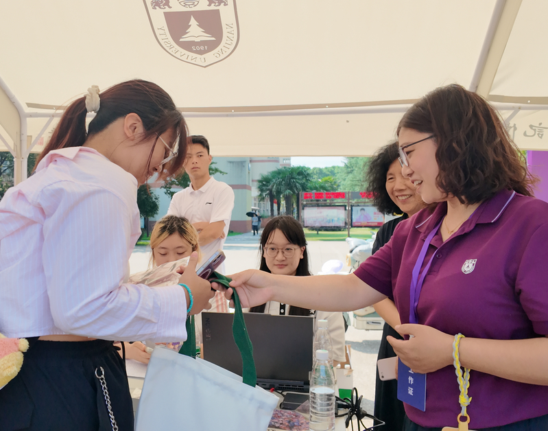 在浦口校区迎新现场,成人导航 院长赵奎英手持学院精心准备的新生礼包,在报到区域等候新生。今年,学院为新生准备的新生礼包内有以学院聂危谷老师、陆庆龙老师画作为素材的系列冰箱贴,以及学院定制帆布袋和笔记本,希望通过学院文创周边,帮助新生快速建立对学院的认知和情感联结,增强新生认同感,传承学院艺术底蕴。期间,赵奎英院长还亲切慰问现场志愿者,对大家的辛勤付出表示肯定。成人导航 辅导员陈小青同步参与迎新工作,协助发放新生礼包,并向新生说明后续可提供的学习生活支持,切实让新生感受到学院关怀。