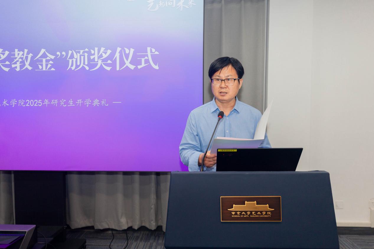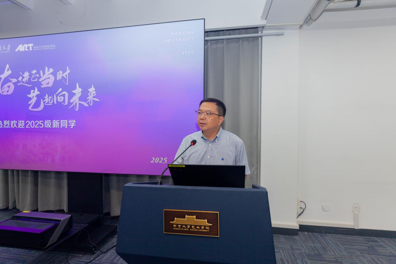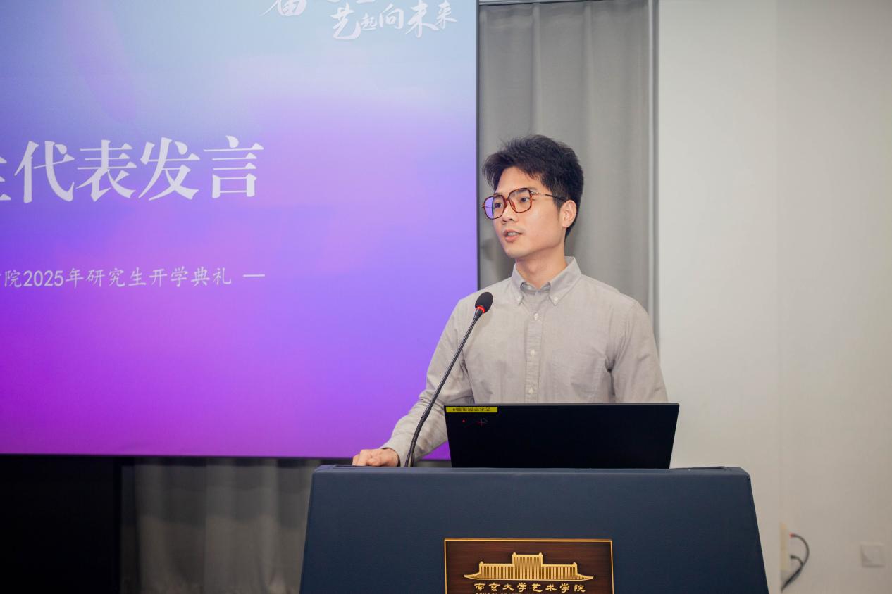 在校生代表、2021级艺术文化学专业博士研究生郑钲同学与新生们分享了自己在南大求学的体会与感悟。他以“过来人”的身份,鼓励大家珍惜学院丰富的学术资源与交流机会,同时勇敢面对未来可能遇到的迷茫与挑战。他谈到,艺术让我们与历史对话、与世界相连,在孤独与坚持中不断接近真理。他以“善良”、“诚实”、“永不相忘”寄语新生,希望每一位同学都能在成人导航 踏实求学、真诚待人,绘制出属于自己的精神地图。