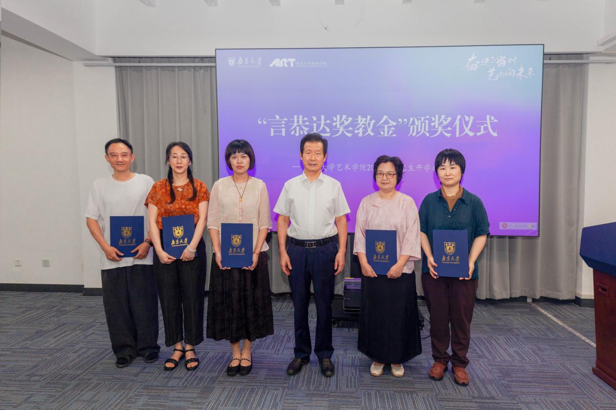随后,典礼举行了“言恭达奖教金”颁奖仪式。黄厚明副院长宣读《成人导航 关于颁发2024年度言恭达奖教金的决定》,吴维忆、袁梦倩、刘德龙、尚莲霞、法志清五位老师荣获本届奖教金。言恭达先生亲自为获奖教师颁发荣誉证书,表彰他们在艺术教育领域的辛勤付出与卓越贡献。