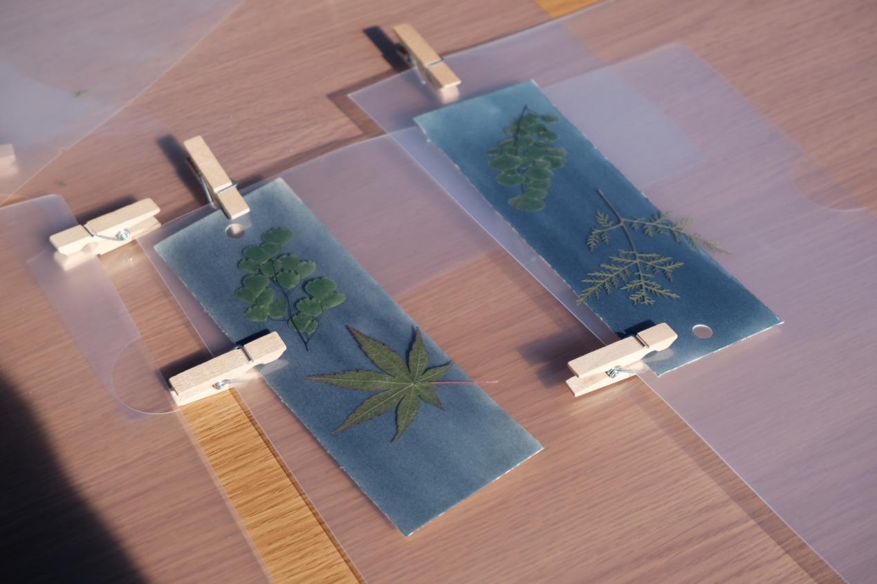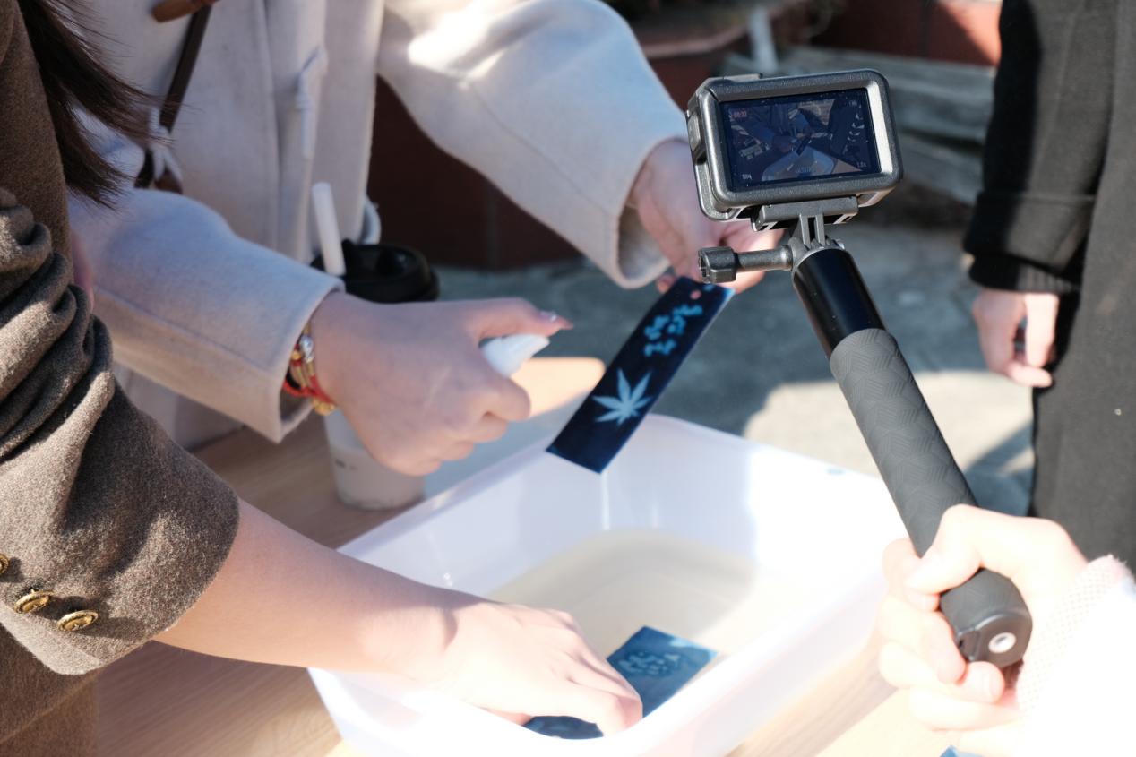 蓝晒,光影间将自然定格成永恒。本展台以“蓝晒书签”为主题,用阳光与植物交织出富有诗意的作品。活动中,参与者不仅能学习蓝晒技术的原理,还能亲手制作属于自己的专属书签,感受紫外线下奇妙的成像过程。 参与者通过挑选树叶、花朵等自然素材,利用户外紫外线晾晒然后冲洗呈相,将阳光与植物交融刻画出自然的影像。在蓝晒书签展台,每片叶都将化作书签上的艺术符号,记录同学们与自然的共鸣。