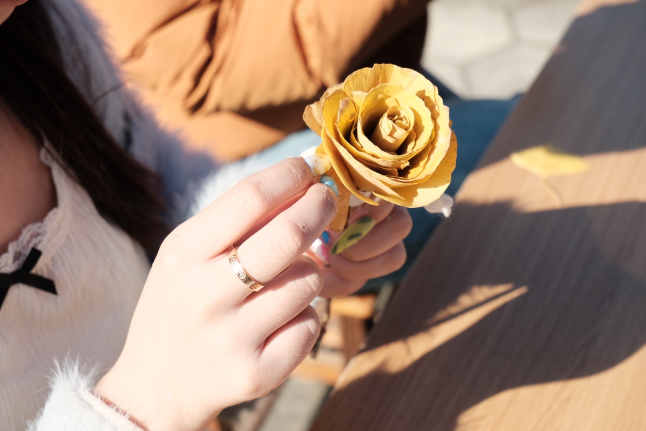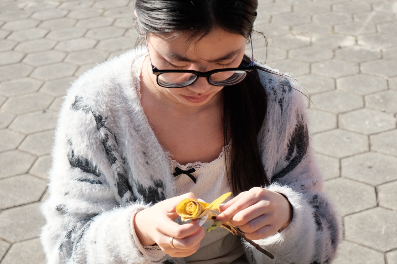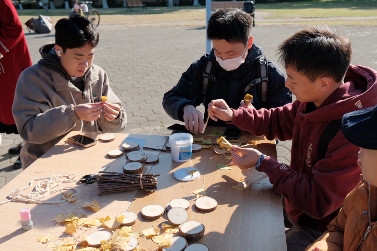 在暖阳的映衬下,银杏圣诞树与玫瑰花展台也吸引了不少同学的参与。参与者巧妙的将一片片银杏叶围绕着树枝,制作成玫瑰花的造型,每一片叶子经过精心的折叠与排列,呈现出花瓣层叠的细腻质感,银杏的金黄与玫瑰的优雅完美结合。这些“银杏玫瑰”象征着秋冬交替中的生命韵律,也传递出大家对自然的赞美与对艺术创作的热忱,看着用心完成的手作,同学们的脸上都洋溢着满足与喜悦。