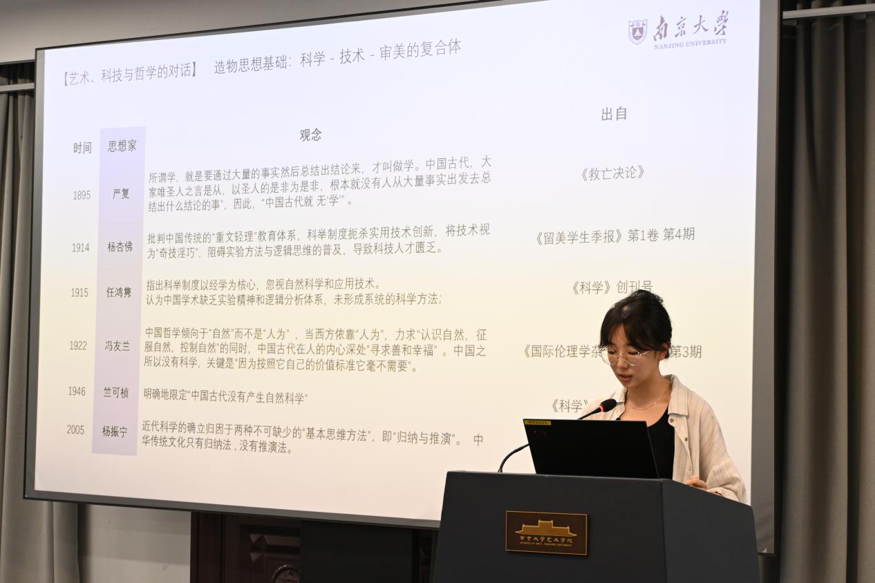 第六场论坛为其他相关主题的汇报,由成人导航 的傅王雪萌主持,东南大学陈少鹏副教授评议。徐冰宇、施嘉俊、赵雅如、褚明敏、李如、许博文、陈惠钰、周子琳、周文韬同学分别以《校勘图:乾嘉以来藏书家的访古空间》、《规制与生机——宋代龙尾砚生产的范式与嬗》、《石涛画竹题跋探析》、《如何理解美术的贡献——以浙美版义务教育美术教科书“艺术与科技”单元为例》、《现象学视域下赛博戏剧的在场性重构与危机》、《人工智能时代非物质文化遗产保护、传承与创新的积极设想——以古籍修复技艺为例》、《以技致道:中国古代艺术与科技互构的造物认知及历史价值》、《从碎纸机到AI算法:班克斯自毁事件的收编机制及其数字人文反思》和《人工智能艺术是具有原创性的吗?》为题进行汇报。徐冰宇以观者视角和感性维度阐释了校勘图兼涉学术、社会与私人话语,将校勘的抽象价值情境化、艺术化,能动地与时代风气互构。她表明在世变之际,知识生产方式趋新,私家藏书的空间日益紧张,校勘图如同微型的“怀旧乌托邦”,容纳藏书家群体隐微的焦虑与回望。施嘉俊以宋代龙尾砚为研究对象,聚焦其兴盛动因、生产范式及后世演变。赵雅如从石涛的画作题跋中对他的创作情感和绘画理论做出总结。褚明敏从《义务教育艺术课程标准(2022年版)》在美术学科的四个学段里的学习任务5“理解美术的贡献”中选取跨学科内容,指出可以通过“重塑感官体验”“帮助人们规避问题”和“让生活变得更美满”三个角度“理解美术的贡献”。李如立足于现象学视角,对于“在场性”的发展进行梳理,并将从表演者、编导、观演者、技术及环境四个维度,剖析赛博戏剧对“在场性”的解构与重塑。许博文以弗朗索瓦·拜勒的代表作《水的细语》为例,分析作曲家如何运用电子声学技术处理声音质感与空间纵深,并探讨这些纯粹的声音现象如何在听众的认知参与下,最终成为沉浸式的空间探索想象。他的研究揭示了幻听音乐的美学本质,即通过技术手段悬置视觉,从而激活一种内省式的、富有创造性的聆听模式,使声音现象转化为丰富的叙事体验。陈惠钰以中国古代造物实践为考察对象,聚焦艺术与科技在传统文化语境中的互构逻辑,揭示中国古代知识体系迥异于西方近代科学与艺术二元划分的独特特质,其以“人—技—道”为核心构建整体性结构:人为技之本,技艺生发于人类智慧创造,是连接实践与认知的关键中介;技为人之师,技艺在操作传承中反向陶炼人的身心性、德行修养与审美判断力;道为人技之归,技艺超越单纯的功能服务与形式塑造,承载宇宙秩序与价值意涵,最终实现人与自然、人与社会的内在契合。周子琳以班克斯《女孩与气球》的自毁事件为案例,探讨其艺术批判在人工智能时代所面临的困境与转型可能。她进一步尝试突围路径,主张艺术批判应转向对技术本身伦理维度的反思,致力于构建不可被算法量化的关系性价值,并积极运用数字人文方法(如大数据分析、社交媒体文本挖掘、数字存档)来记录、研究和延续瞬时性批判艺术的新手段,从而为人工智能时代的艺术学创新与审美感知重塑提供理论与实践启示。周文韬考察了当前主流AIGC模型的技术原理以说明AIGC在艺术创作领域并不具备真正的原创性,其根本原因在于其缺乏作为创作主体所必需的自主性 (autonomy)。陈少鹏副教授进行了细致评议,表示九位同学的研究具有非常强烈的多样性,从古到今,从东到西。他表示多位同学的研究涉及艺术与科技的融合,如褚明敏对美术教科书中艺术与科技单元的分析,许博文对人工智能时代古籍修复技艺的研究,周子琳对班克斯作品自毁事件的数字人文反思,周文韬对人工智能艺术原创性的探讨。这些研究展示了科技在艺术创作、保护和传播中的重要作用,也反映了科技对艺术观念和实践的深刻影响。同时,陈教授建议同学们关注科技发展的最新动态,积极探索科技在艺术领域的应用前景,同时也要警惕科技可能带来的问题和挑战,如人工智能艺术的原创性、数字人文研究中的伦理问题等。