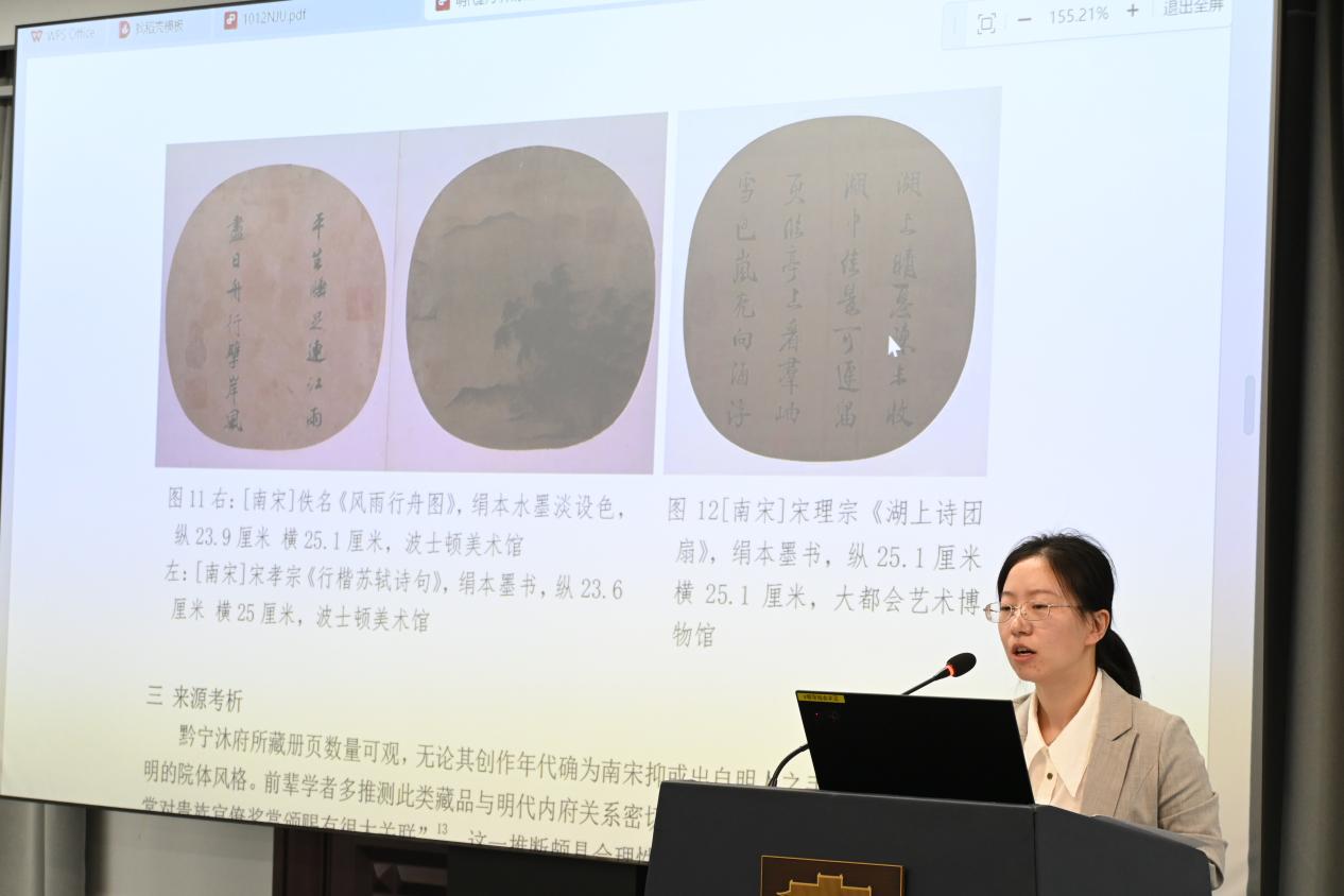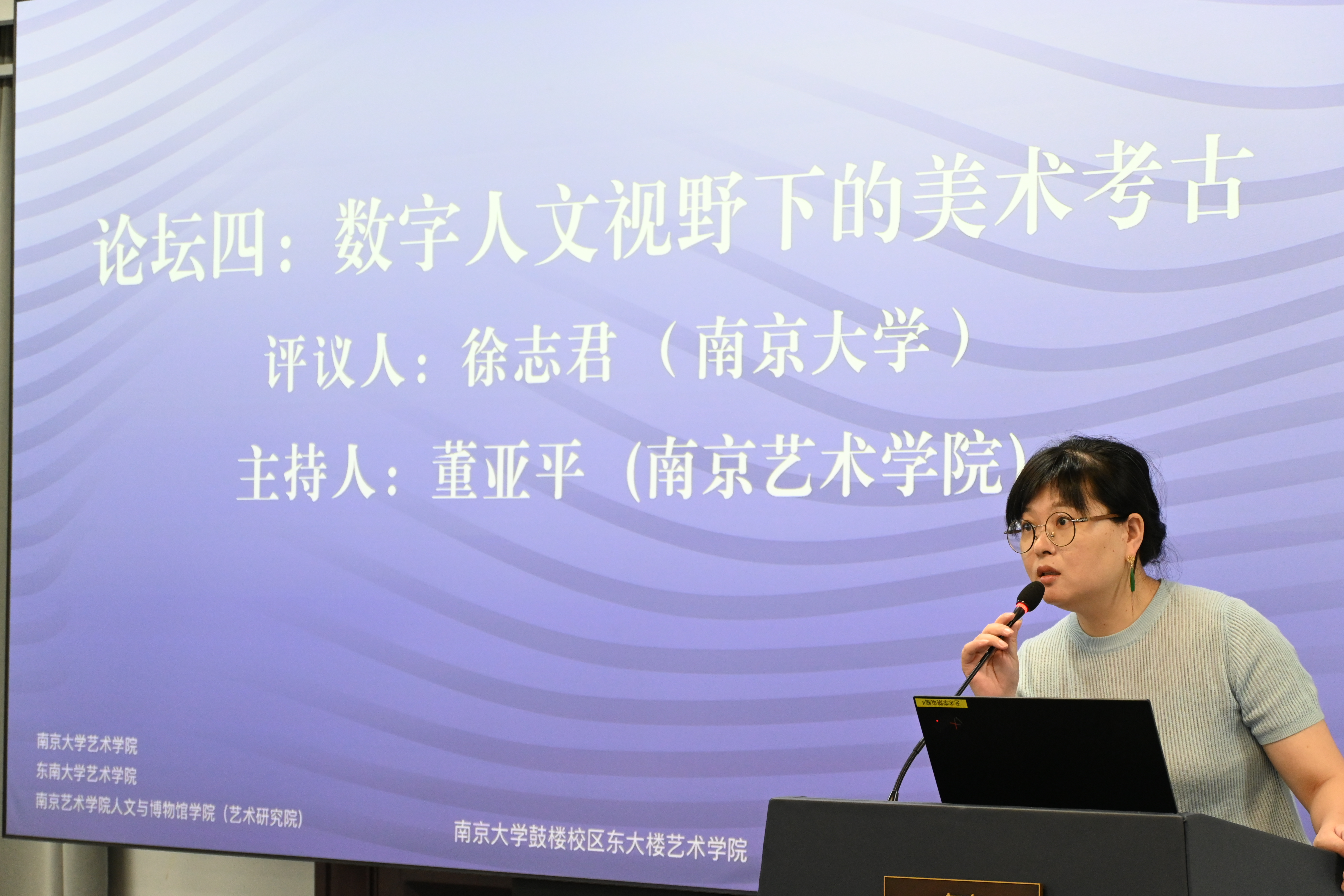 论坛第四场“数字人文视野下的美术考古”由南京成人导航 董亚平主持,南京⼤学美徐志君助理教授任评议嘉宾。董亚平、徐琰、赵丹、郑嘉昊、张珂艺、原天羽、古康、吴沐霜同学分别以《正统承续:谶纬视域下东吴禅国山碑考释》、《陈容“所翁龙图样”的跨媒介运用研究 》、《形塑河源——图像阐释学视域下的中国古代舆图葫芦图像考析》、《倪瓒<十万图>真伪及流传考——兼论王翚的四件<十万图>仿本 》、《乾隆朝<平定两金川得胜图>铜版画的制作、传播与贮藏》、《明代黔宁沐府的册页收藏:规模、年代、来源与后世之名》、《汉地树下坐禅比丘形象探赜——以云冈石窟和河南造像碑为例》和《唐代关中贵族墓葬壁画视觉语言探析——基于空间叙事与图像配置的双重维度》为题,围绕着中国古代艺术史的不同方面展开。他们的汇报展示了中国古代艺术史研究的丰富性和多样性,通过跨学科的方法和多视角的分析,深入探讨了艺术作品的历史背景、文化内涵和艺术价值。徐志君老师表示希望同学们把一个比较抽象,或者比较宏大的问题拆分到具体细致的、可探究的、比较少的依赖于情感的材料和结论方面去。