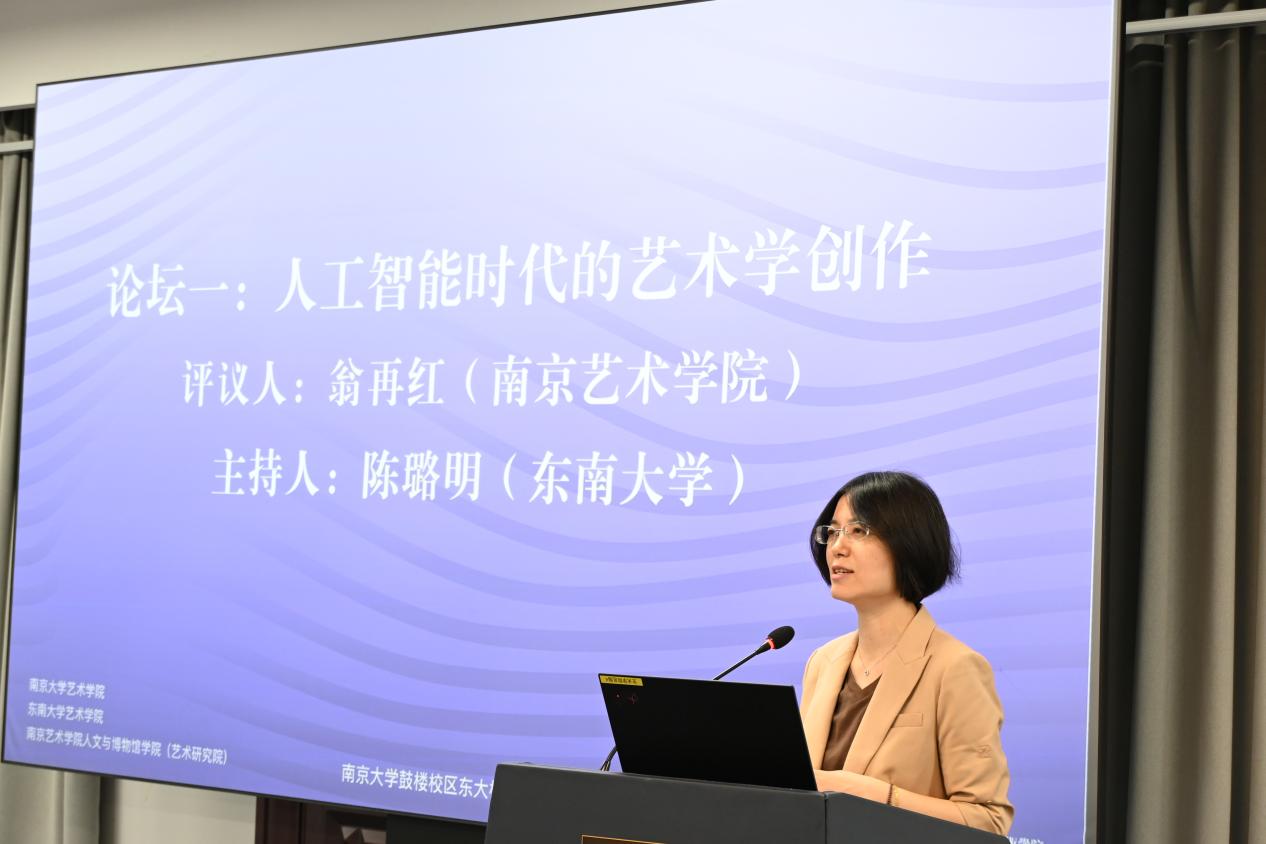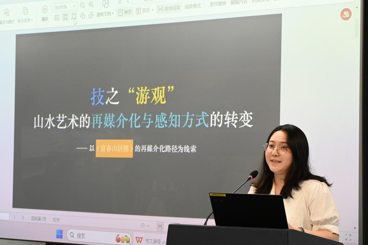 第一场关于“人工智能时代的艺术学创作 ”的讨论于310报告厅进行,主持人为东南大学博士生陈璐明,南京成人导航 人文与博物馆学院(艺术研究院)副院长翁再红教授担任评议人。陈璐明、赵玉琪、吴行健、姜丞怡、王静、邹青宸分别以《情动、共同体与想象力:中国电影跨文化传播的智能方案》、《从田野到云端:数字化时代背景下浒浦花鼓的传承与创新》、《编剧还是工具?——人机协同背景下剧本创作主体的边界争议》、《当代接受美学中文征明对沈周绘画的学习》、《走近、走远:夏尔丹的<肥皂泡>及沙龙展陈》和《从“笔墨为心迹”到“算法为媒介”:人工智能介入下中国山水画创作困境与伦理重构》为题,都关注数字技术或人工智能在艺术创作、文化传播和审美接受中的应用,探讨如何在利用新技术的同时,保持和传承传统艺术和文化的价值。南京成人导航 的翁再红教授为每位同学的论文都进行了细致的评审,表示虽然他们的研究领域和具体问题各有侧重,但都关注了在技术介入的背景下,创作主体的角色变化及其带来的伦理挑战,并试图寻找在技术与传统之间平衡的方法和路径。翁再红教授依据自己在学术研究领域的专长以及治学经验,给他们具体的改进建议。