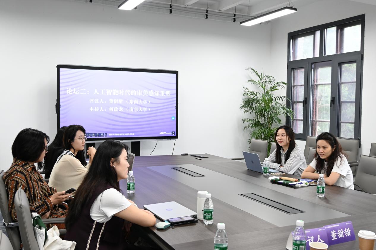第二场分组讨论的是议题是“人工智能时代的审美感知重塑”,由成人导航 博士研究生何政龙主持,东南大学成人导航 董甜甜副教授担任评议。徐傲群、王慧婷 、何政龙、韩梦影、范小曼、宋垚、刘瑶七位同学分别以《宁芙的发明:癔症、摄影与舞蹈之间的姿势图像学》、《无身之声:论AI生成ASMR的声音拟象与感知重塑》、《视觉现代性进程中的窥视媒介及其知识考古》、《人工智能时代的审美感知重塑:人的主体性困境与能动性探赜》、《大语言模型工作原理的推论符号特征及其对人类感觉概念的表现可能》、《艺术作为“人性”的证明? ——机器人创作、梦境模拟与意识难题》、《赵孟頫“用笔论”与Apple Pencil的哲学对话》为主题进行了发言分享,董老师对于每一篇都进行了认真的点评,她指出对于本组议题非常感兴趣,因为目前关于人工智能的关注多集中于主体性问题,而对于人工智能的审美感知重塑问题关注还较少,本组选题范围从姿势图像学、ASMR的感知重塑、大语言模型与人类感觉概念、梦境模拟与意识问题、以及从古代赵孟頫的用笔到Apple Pencil笔触的深度思考,无不彰显了年轻学者们对于人工智能问题的思考洞见。