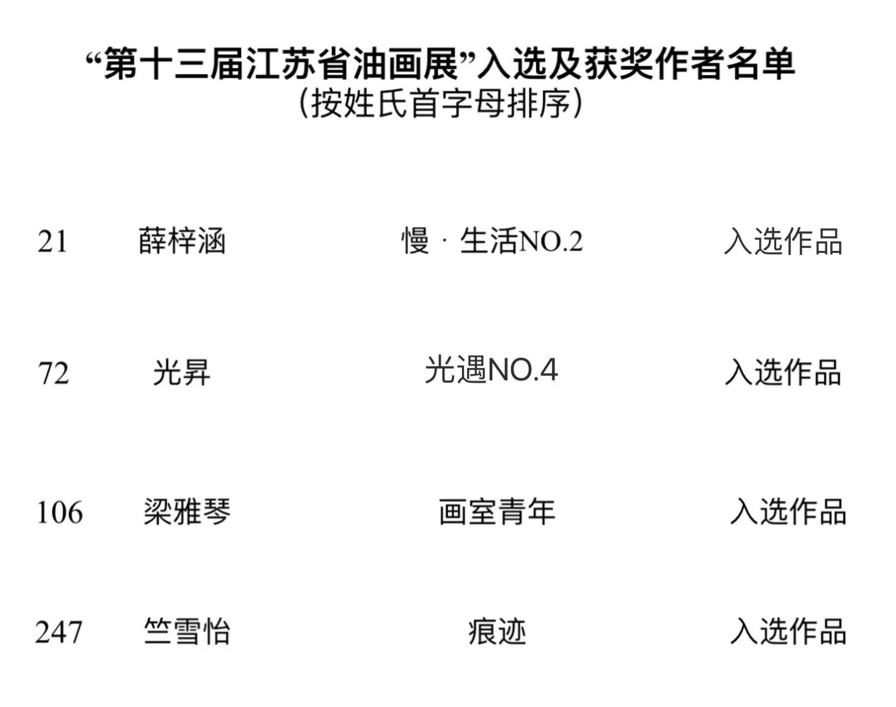 在此背景下, 成人导航 学子以高度的热情与卓越的才华,积极响应号召,创作出了一系列令人瞩目的优秀作品,在“中美协—悲鸿风度第二届油画双年展”、“江苏省第二届书法临帖作品展”、“江苏省第十三届油画展”多个重量级展览中大放异彩,取得了令人骄傲的成绩。具体名单如下。