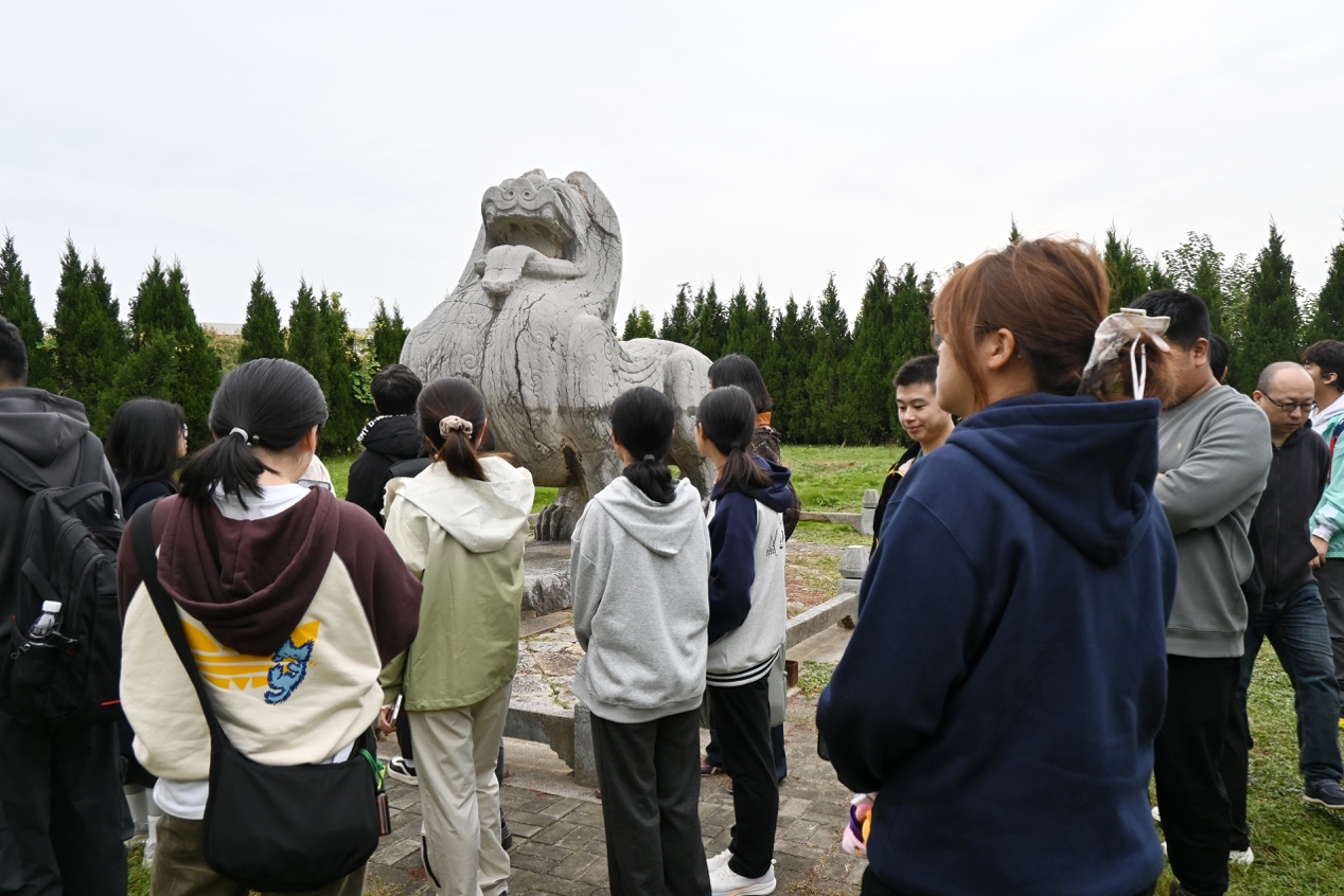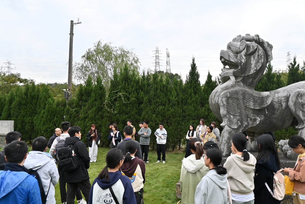 文学人文课程负责人李丹老师在石兽前告诉同学们:齐梁文学以诗歌、骈文为主,门阀世族重视文化素养,推动了文学形式技巧的发展。骈文强调声律对仗,永明声律更为唐诗格律奠定了基础。这一时期,文学理论亦有系统突破——《文心雕龙》构建了完整理论体系,《诗品》专注五言诗评,使文学批评进一步丰富。墓主萧统所编《昭明文选》规模宏大、选文精审,是中国现存最早的诗文总集。《南史》本传称萧统“于时东宫有书几三万卷,名才并集,文学之盛,晋、宋以来未之有也。”时隔千年,南雍学子访古问俗、寻幽探胜,在先贤埋骨处体味古今,深悟中华文脉的源远流长。