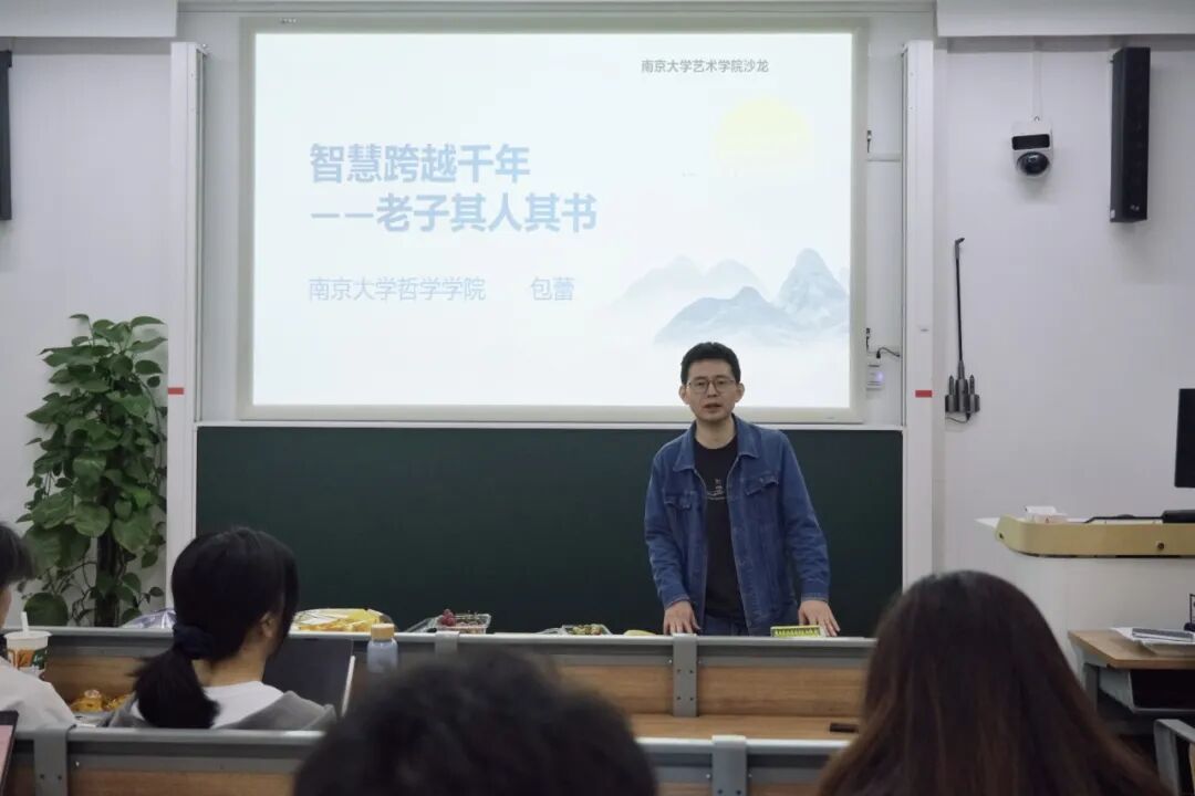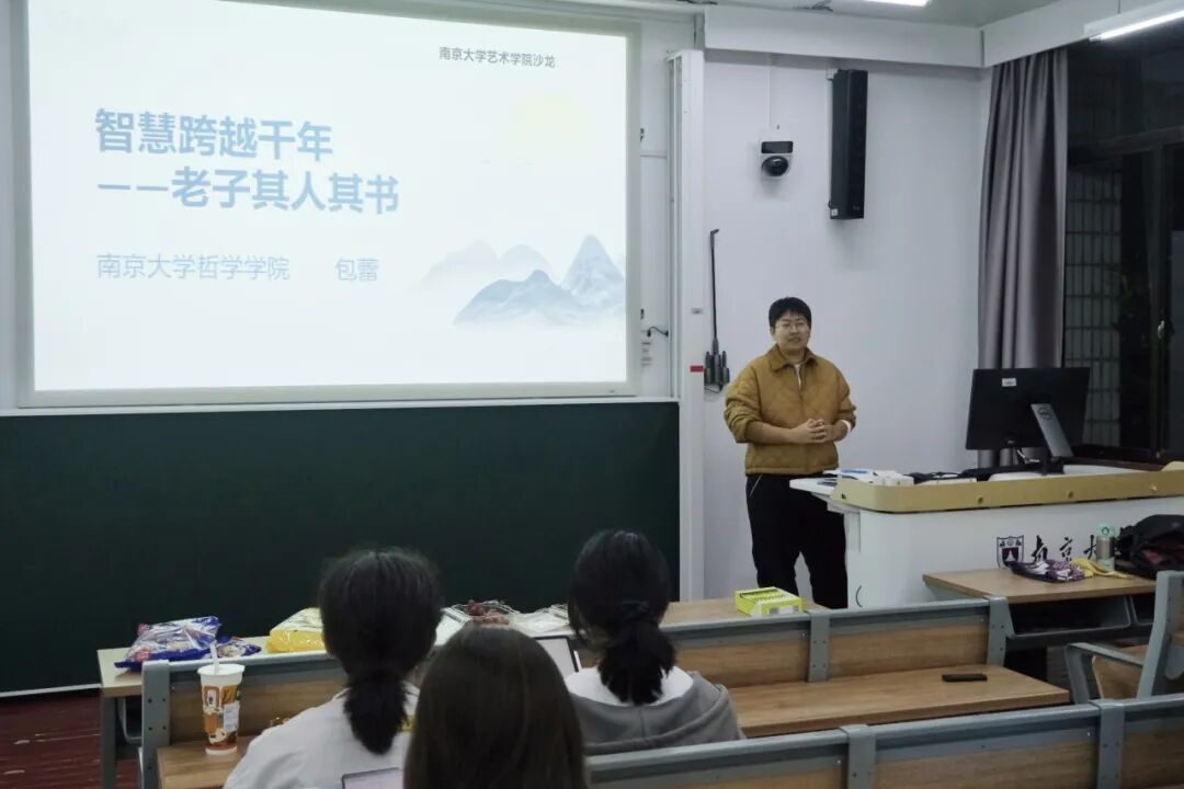 沙龙伊始,包蕾老师首先回忆起本科阶段在浦口校区的求学经历,故地重游,她感慨良多。随后介绍了自己的研究方向,并引出本次沙龙的焦点——老子哲学。她指明,本次沙龙不仅会贴合艺术学科来解读老子其人其书,还将增设图像化内容,以期在哲学与艺术之间搭建一座沟通的桥梁。