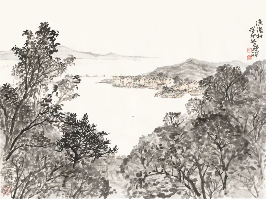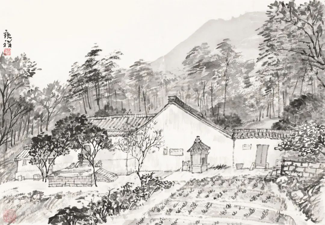 我下笔之前心中已有整体的构图,景物又就在眼前,所以构图和造型的问题没有了。下笔后我需要注意的是如何取舍、概括和如何运用笔墨。特别是用笔用墨,是我要重点考虑的。因为对于水墨画来说,成功与否往往取决于笔墨。起笔时,我习惯先从主要景物开始,其他的地方围绕主景来生发。这样笔墨也比较连贯,有的地方要一气呵成。主景的大小要服从于整体构图,比如如果先画建筑,就要注意它与树木、山石之间的关系。我写生时不打轮廓,但胸有成竹。