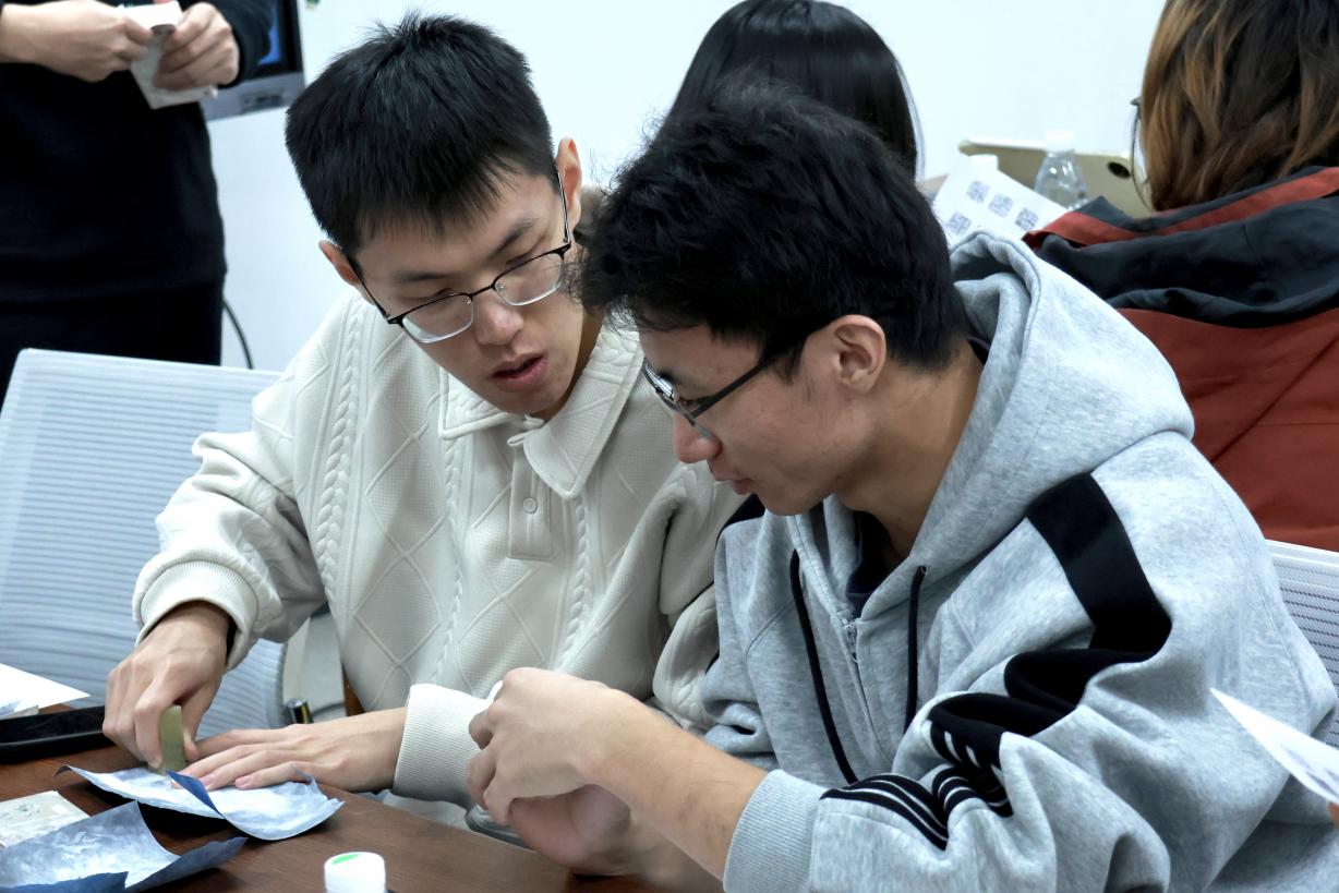 实操体验环节,现场备齐刻刀、印石等全套工具,零基础的同学们在老师的细致指导下逐步上手。参与者们精心挑选设计了富有个性的字体、字形或图案,通过对刻刀的熟悉与驾驭,各自创作出一面面富有特色和韵味的印章。不少同学表示,在主讲人的演示与自己的钻研体会之间,深刻的领会到了篆刻艺术的瑰丽与荣耀,以及其千年不坠的美学密码。当一方方带着个人印记的篆刻作品新鲜出炉时,大家脸上都洋溢着满满的成就感,纷纷展示自己的“第一方印”,分享创作过程中的感悟与收获。