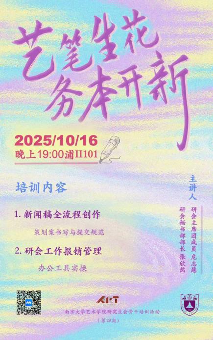 活动由2024级美术与书法专业硕士、院研究生会主席团成员危志慧与秘书部部长张欣然主讲。张欣然从新闻稿的五大关键环节入手,细致剖析优秀稿件的构成要素,并结合实际案例,深入讲解活动策划案的结构要点与撰写技巧。危志慧则围绕办公实务,系统介绍了报销流程、南大云盘使用、Excel高效操作及任务绩效管理等内容,助力同学们科学、规范地开展日常工作。