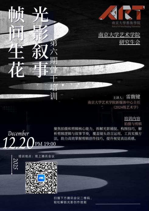 12月20日,收官之期“光影叙事,帧间生花”通过线上方式举行,聚焦视频内容创作全流程。主讲人新媒体中心主任雷馥键系统梳理拍摄与剪辑的核心规范,从构图技巧、画面控制到景别运用与机位移动,逐一讲解如何通过镜头语言增强叙事表现力。