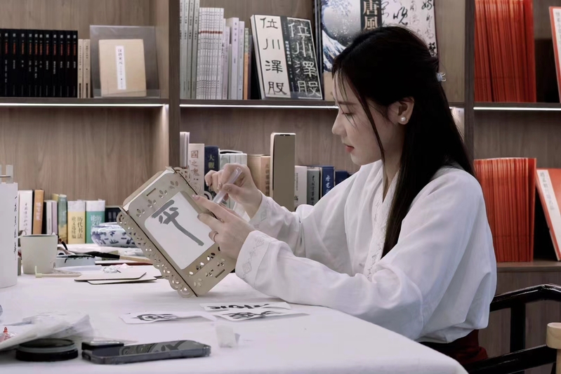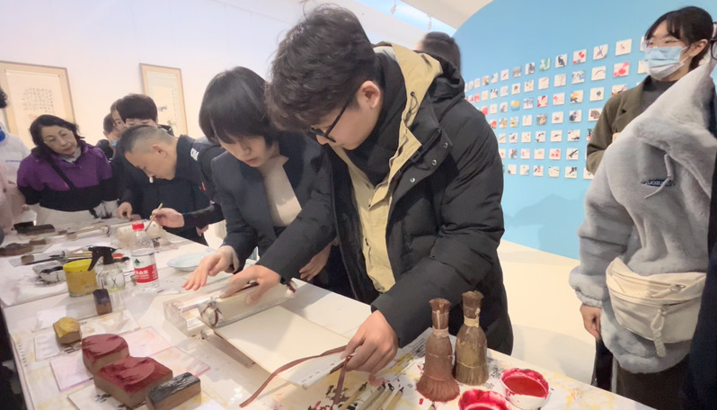 (图片1)团队成员张世川正在“荣宝斋350周年木版水印艺术特展”现场体验木版水印工艺