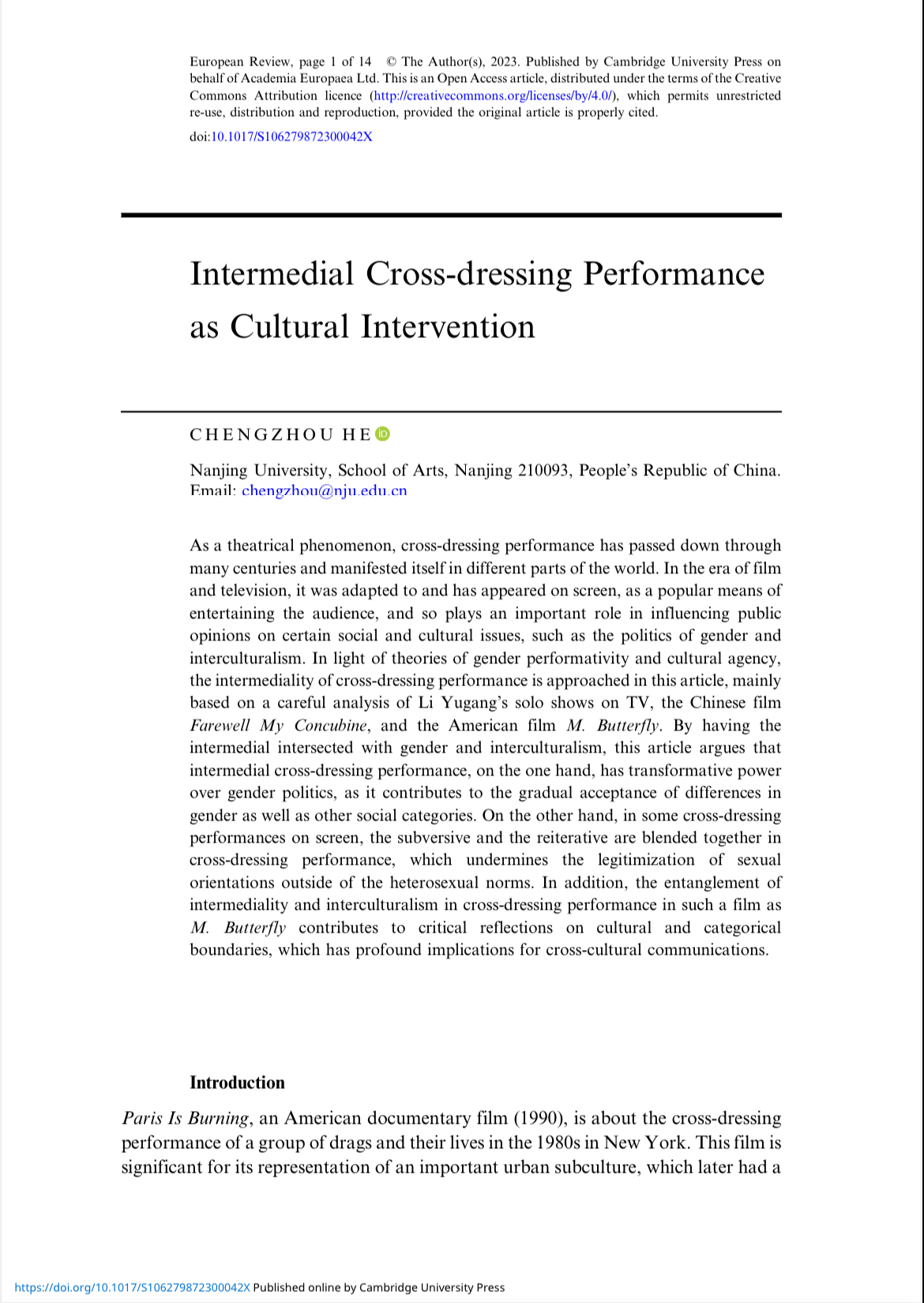 EUROPEAN REVIEW(《欧洲评论》,SSCI收录期刊)是欧洲科学院院刊,202310月推出跨媒介研究专辑,由成人导航 何成洲教授和瑞典学者Jorgen Bruhn教授主编,发表10篇论文,作者来自中国、英国、丹麦、瑞典等国家。