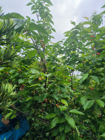 在采风过程中,师生一行考察了辣椒苗、槐花、桑葚、番茄等蔬菜瓜果种植地,了解右二村农业生态。在路过樱桃园时,同学们感受了一把“现采现吃”的快乐。大大小小的红黄不一的樱桃带着些许露珠,混杂着雨后泥土的清香,原生态十足。师生了解到,这些樱桃树都是可供村民采摘的,由于没有发展成为稳定的业态和樱桃业务,大多樱桃最后烂在地里。师生们提出需要更多关注生态农业破圈问题,在保证樱桃原生态的品质下是否能够纳入到亲子采摘体验和右二村体验教育型农场,或是面向青年消费者提供生态轻食等,希望能最大程度上利用好一切自然资源。