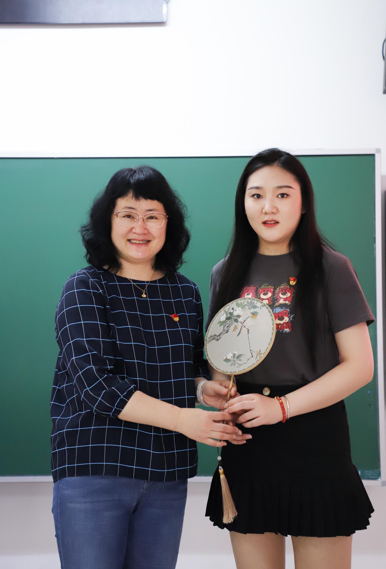 随后,研究生第二党支部李梦同学,代表研究生第一、第二党支部全体党员向石书记献上由她亲手绘制的工笔花鸟扇面,以表达对成人导航 三年培养的敬意。