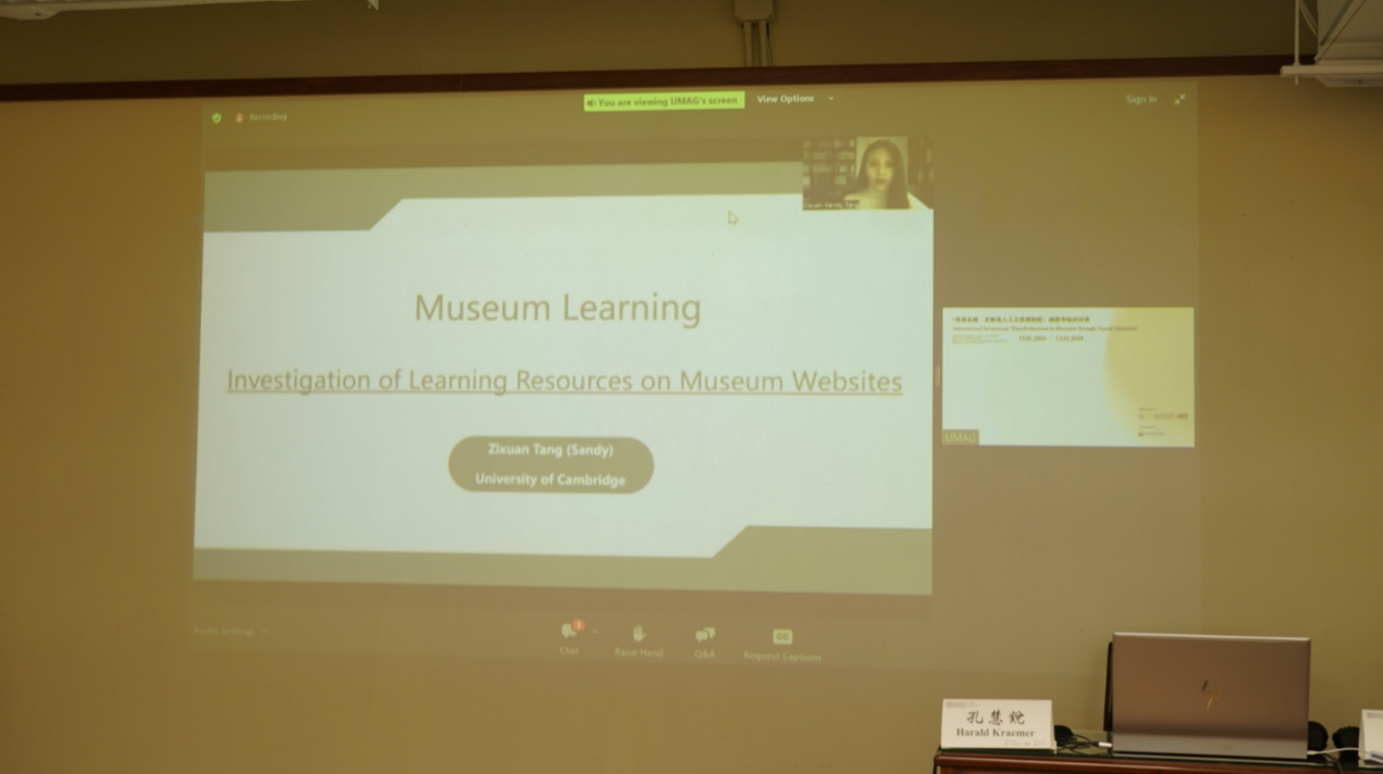 其后,来自英国剑桥大学的博士研究生唐子璇发表了题为Investigation of Learning Resources on Museum Websites的主旨演讲,指出博物馆线上学习资源的开发过程需考虑多层面因素,并采用活动理论(CHAT)探索了影响线上资源制作的不同因素及其关联,强调博物馆学习的个体行为应与广泛的社会和文化背景相关联。